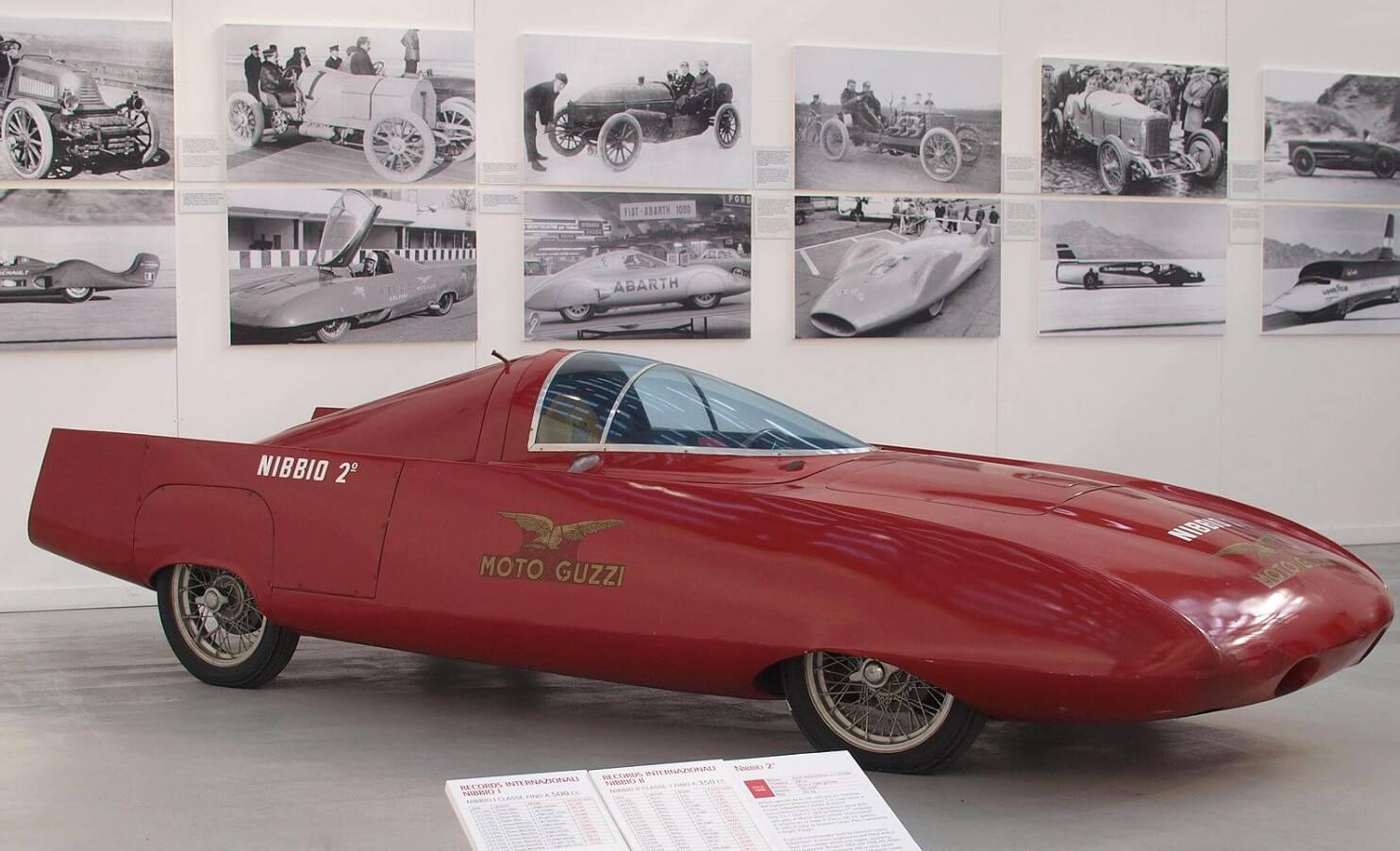 The engine of NIBBIO ('red kite', named after a bird of prey, that is common in the region) will be the 493.6 cc Moto Guzzi 120 degrees V2 that delivers 47 hp. Ulisse Guzzi makes the first test drive from Mandello to Varenna and already reaches speeds of over 100 km/h. During tests at the Monza circuit, motorcycle racer Amilcar Moretti drives a lap at an average of 148 km/h. In a later test on the same circuit, Ulisse Guzzi achieves an average of 157 km/h. On October 16, 1935, NIBBIO is ready to break records. On the highway (now A76) between Altopascio and Lucca, 4 records are broken in International Class I: Standing and flying km and mile. NIBBIO is the very first 500cc car to break the 100 mph (162 km/h) barrier! Driver: Giovanni Lurani.