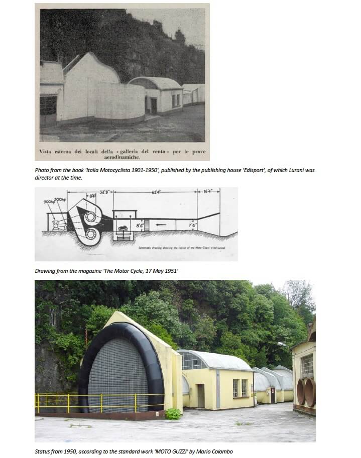 This raises some questions, Moto Guzzi/Piaggio speak, as far as the wind tunnel is concerned, only about the period 1950-1954, whether the wind tunnel would have already been there in 1935 remains uncertain. Immediately after World War II, it was decided in a Moto Guzzi board meeting to suspend all investments in buildings and machinery for the time being, with only one exception: On the intercession of Carlo Guzzi, investments in the wind tunnel are spared. That wind tunnel may have looked like the attached ‘black and white’ photo at the time. The 'wind' is generated with two ‘paddle-blades’ (see drawing), powered by a 900 hp, 12-cylinder FIAT aircraft engine (which was already available since 1927!). In 1950 the version of the color photo would have been officially put into use, only the building with the rounded roof survived the renovation, a 310 hp electric motor now drives a propeller.