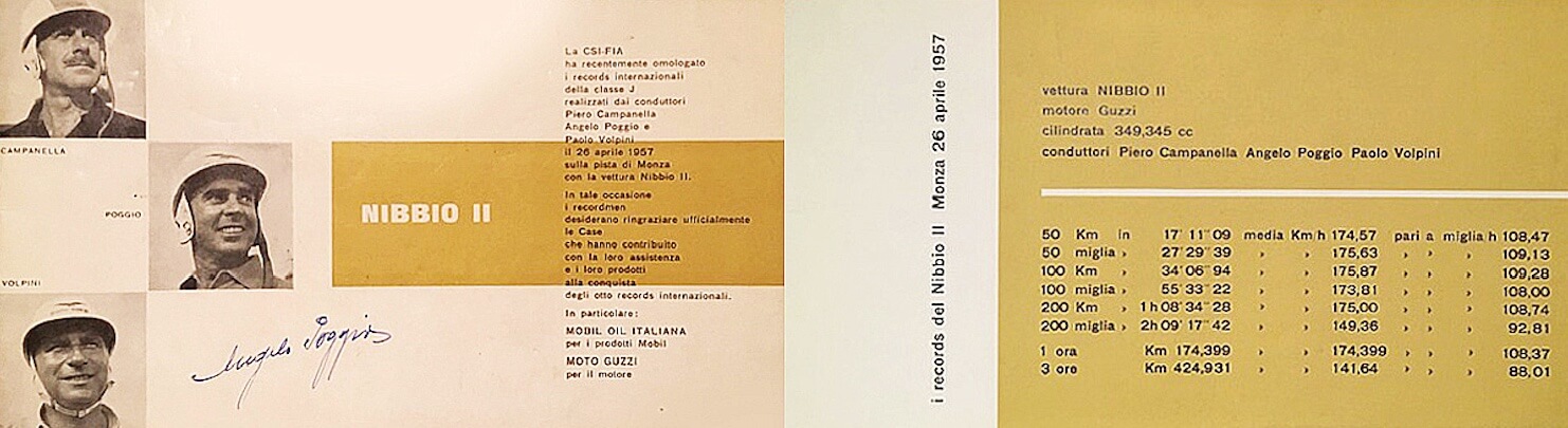 My curiosity for this story was aroused by a photo of one of the record cars on the internet and I thought: "Huh?... is that a Moto Guzzi?". But it was really written on its bodyside! After further searching the web, I found quite a bit of information, which, however, often turned out to be incomplete or downright contradictory. I also found that in 2017, among the very expensive classic cars of the major car brands, 'NIBBIO' won the ‘Coppa d’Oro’ of the world-renowned and very prestigious 'Concorso d'Eleganza Villa d' Este'! But I'm getting ahead of myself, let me first introduce myself: