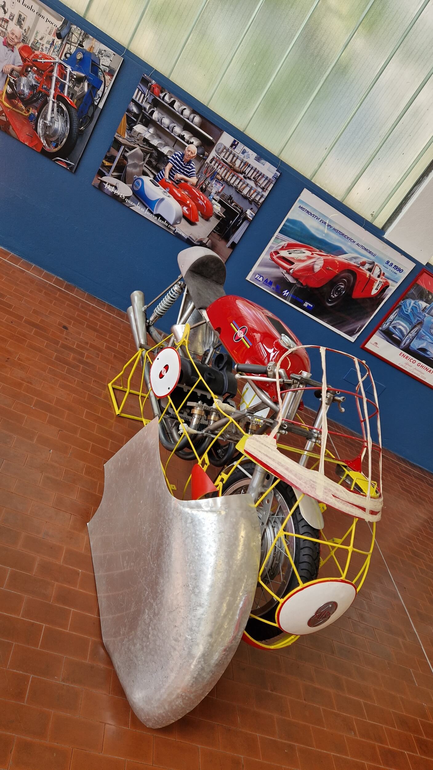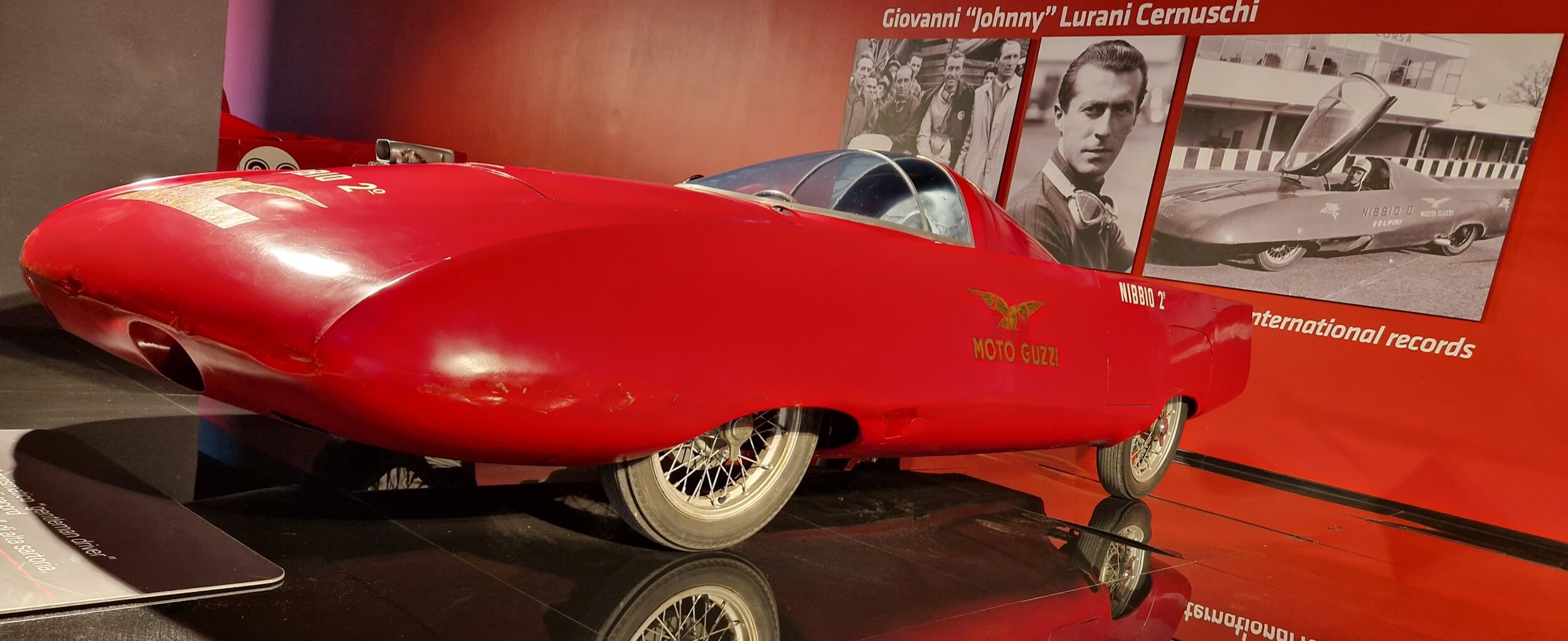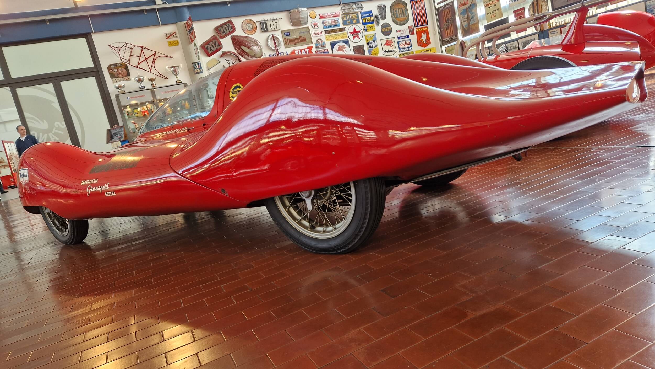 Then it was party time again, I was going to cross the Northern Apennines for a second time, this time towards Modena. And again, the route did not disappoint. Around noon I report to my hotel. Plenty of time for the 'Museo Enzo Ferrari', at the place where it all started for Enzo. Unfortunately, this museum is, as far as I'm concerned, too clinical to be really interesting. The next day I walked to the place I came to Modena for: At 10 o'clock I had an appointment at 'Museo Stanguellini': Here is 'COLIBRI', the 3rd and last of the Guzzi record cars. This visit was one of the highlights of my trip. I was the only guest in the small museum and get a tour from Erina Fukui, a Japanese lady who works there as a historian: As expected, there was valuable information to be collected. Unlike MAUTO, the cars here are not fenced off, and they can be viewed from all sides and photographed up close. 'COLIBRI' is magnificent!
