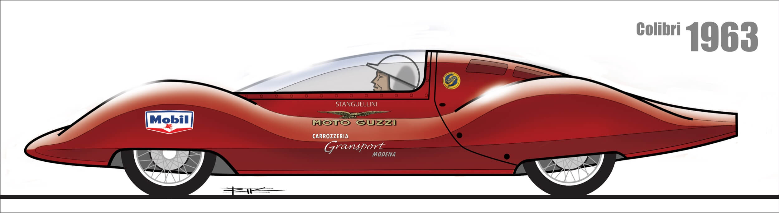 1963: The last generation of record cars is known as COLIBRI’. 'Stanguellini' is responsible for the tubular chassis, the aluminium body is manufactured by 'Vaccari-Baccrini-Carrozzeria Gransport' from Modena. The great Franco Scaglione ('father' of the '67 Alfa Romeo 33 Stradale!) is responsible for the design. Rumour has it that the intention was to put Guzzi's 500cc V8 in the car, but that doesn't seem likely. The records are taken with the 246.8 cc engine from the 1959 NIBBIO 2, which now delivers 29 hp to push a dry weight of 310 kg forward to a maximum speed of 180+ km/h. 5 new speed records are set at Monza. COLIBRI’ can be admired in 'Museo Stanguellini' in Modena.