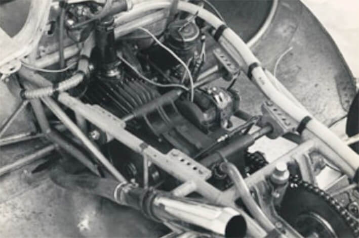 1956: The first driving version of NIBBIO 2 is equipped with Guzzi's 349 cc, horizontal 1-cylinder with 2 overhead camshafts which delivers 37 hp. The gearbox features 5 gears. As with NIBBIO, the drive is done by means of a chain to the rear axle, there is no differential. The car weighs approx. 350 kg and reaches a maximum speed of more than 185 km/h. Guzzi also used the engine in the 350GP motorcycle with which world championships were won in '55 and '56. NIBBIO 2 set several new records in Class D (up to 350cc) in multiple sessions at Monza.
