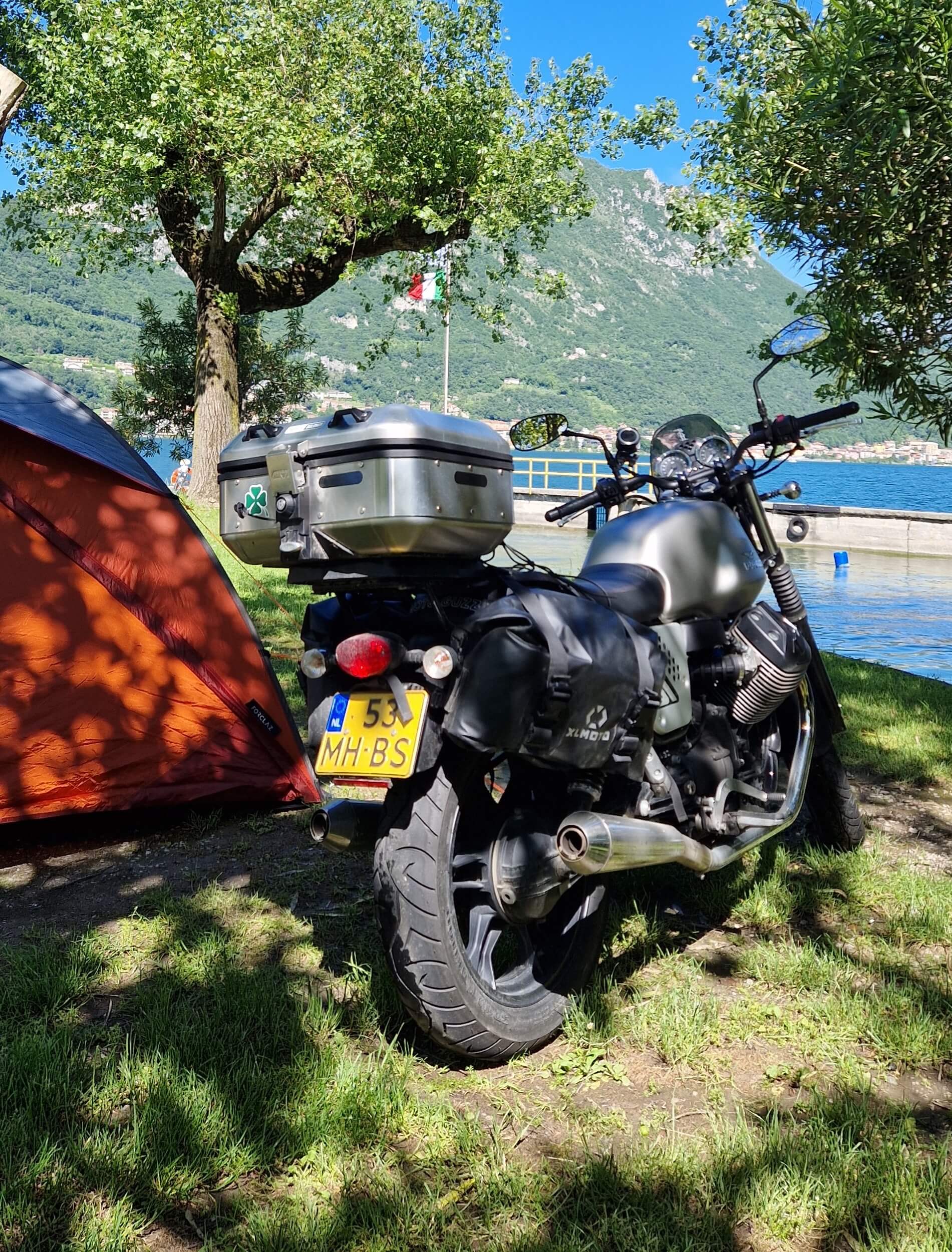 The next day, the 5 of us drove to 'Campeggio Rivabella' on Lake Como. Because the weather had finally improved, I decided to camp there for another 2 nights. After a joint breakfast at the campsite, my travel companions said goodbye and left for home. A place for my tent right on the waterfront, sun and blue sky: it just doesn't get any better than that! A little later I got into a conversation with an Australian who was exploring Europe with his wife, by camper. He was attracted by my Guzzi, is a fanatic motorcyclist himself and knows Teo Lamers (famous Dutch Guzzi specialist, now living in Australia), so we had a very pleasant afternoon.