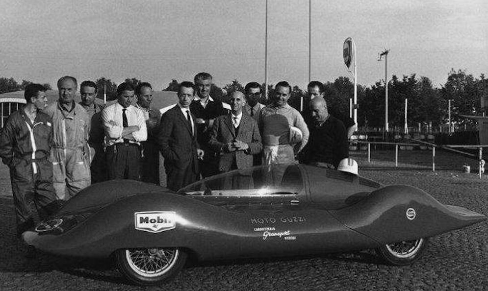 1959: Another record car was developed within the Moto Guzzi company itself. The 'Moto Guzzi COBRA' proved that, aerodynamically, it was possible to go even 'flatter'. This time, the initiative came from renowned Guzzi engineers Giulio Carcano and Enrico Cantoni. Motorcyclist Gino Cavanna (formerly a speed record holder on Guzzi motorcycles) was lying in the car, headfirst! The well-known 248.6 cc 1-cylinder with compressor drives the very closely spaced rear wheels. 4 records were taken on the highway between Parma and Reggio Emilia, in the same year as NIBBIO 2, which drove in the class up to 250cc. COBRA, because of the compressor, in the class up to 350 cc.
