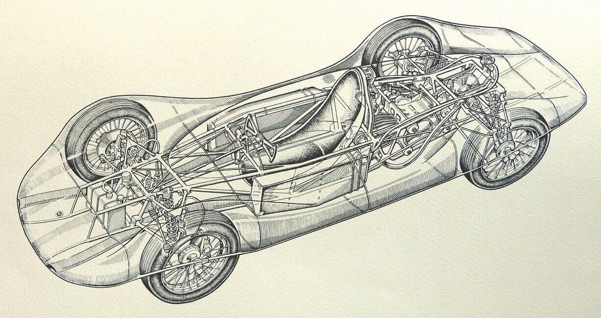 1935: Giovanni Lurani and Ulisse Guzzi set the development of the record car in motion. It will be the first(!) car with a steel space frame (of 'Colombo' aircraft quality), welded together by 'Quadrio Works' in Milan. The front axle is taken from a FIAT 508 Balilla, for the rear axle they initially thought off that of a Moto Guzzi Trialce, but for safety reasons, the wheels would have to be sprung. The chain drive remained, as did the ‘band brake’ as the only means to slow the car down! The body is hammered from aluminum sheet by 'Carrozzeria RIVA' in Merate and is tested in the Guzzi wind tunnel (according to Lurani in his book 'Racing around the World' (1954): "The first thing that was done at Mandello was to carry (literally) "Nibbio" into the wind tunnel of the Guzzi works, where with a wind of 170 km/h it was soon evident that the streamlined shape was good, but that the air intake to the engine had to be considerably modified and fitted with appropriate deflectors").