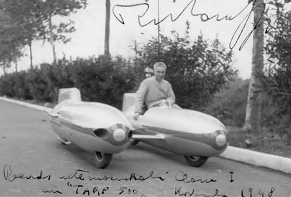 Bisiluro TARF 1 (with Moto Guzzi engine) and Piero Taruff (November 1948).