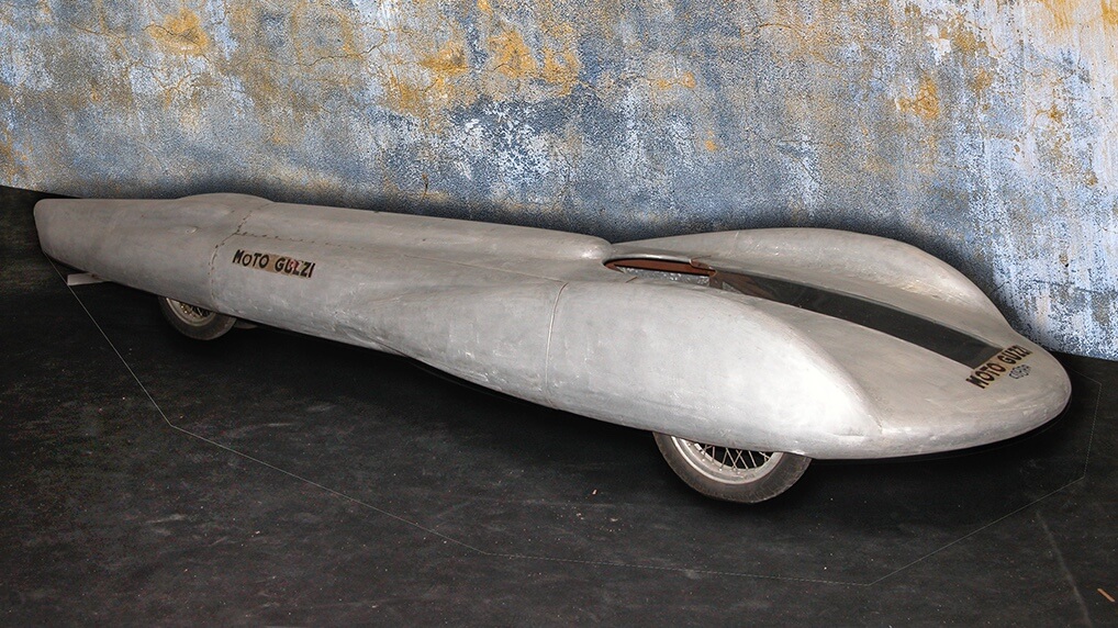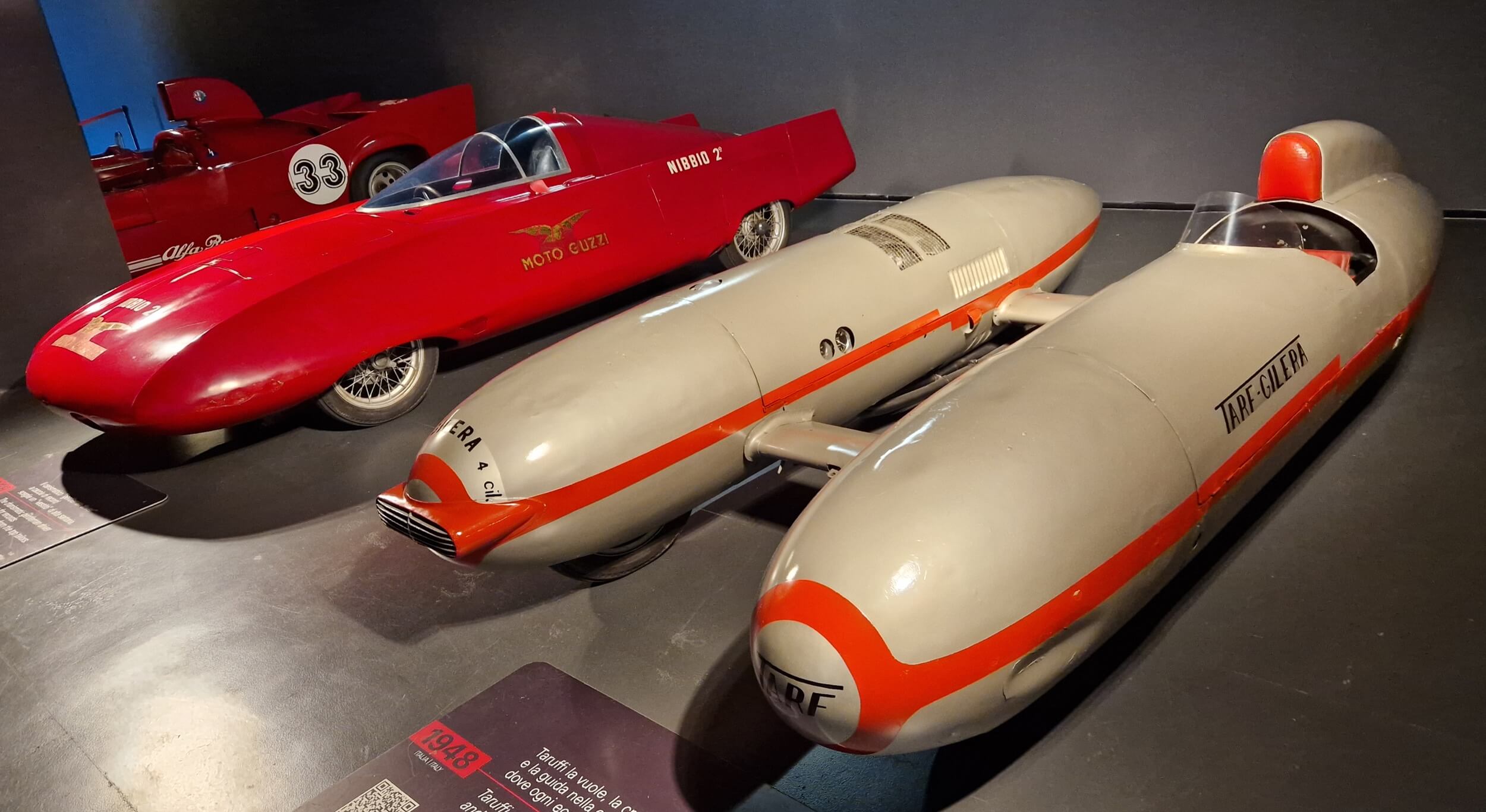 1948: Because of my fascination for the adventures of Giovanni Lurani and the beautiful, evolutionary path he took, I almost overlooked two other record cars powered by Moto Guzzi engines. One of them was built by another famous driver/constructor: Piero Taruffi. He conceived and built the 'BISILURO TARF'. Where BISILURO stands for '2 torpedoes', exactly as the car was built. The vehicle was driven with 2 handles on either side of the driver. In the first version of this car, the Guzzi 493.6 cc 120 degrees V2 was used. In 1948, 6 speed records were set with it. A later version of the TARF 1 was powered by a 350cc engine from Gilera. The later TARF 2 got a 4-cylinder 1720cc Maserati engine. It eventually reached speeds of more than 300 km/h! The car ended up in Australia where a Ferrari Dino V6 engine was installed, but by then there is no longer any question of originality. The version with Gilera engine can be seen in MAUTO, right next to NIBBIO 2.