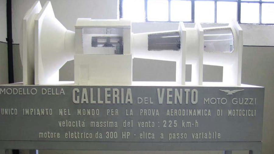 An archive photo of the wind tunnel at the Moto Guzzi factory in Mandello del Lario; below, the model on display in the Moto Guzzi Museum.