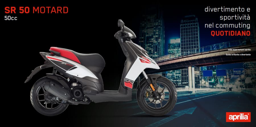 SR 50 Motard: fun and sportsmanship on the daily commute; Aprilia supermotard style, fun and exciting to ride (50cc, 2-stroke). Available in: Racing Grey, Racing Black, Racing White. Accessories: top box, windshield, universal leg cover, anti-theft starting lock, deflector kit, electronic anti-theft device, vehicle cover.