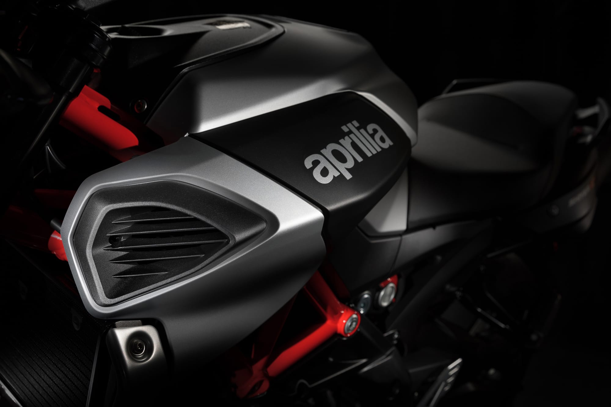 The sporty, three-spoked wheel rims are also new, inspired by the standard Aprilia Tuono V4 wheels and contributors to containing the weight, reducing the front by 0.9 kg and the rear by 1.3 kg. This leads to a drastic reduction of the gyroscopic effect and therefore greater agility for the bike, improved suspension functionality thanks to the reduction of unsprung masses and quicker acceleration. The new wheel rims are shod with 120/70 tyres on the front and 180/55 on the rear. The braking system, equipped with two-channel ABS, implements radial callipers to highlight the sportiness of the project and 320 mm discs on the front. On the rear, a 240 mm disc is gripped by a single-piston calliper.