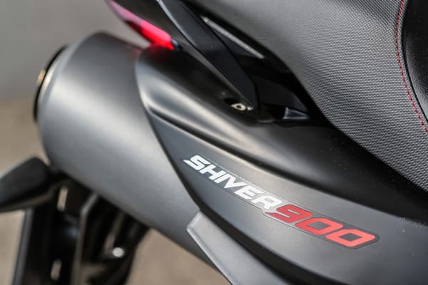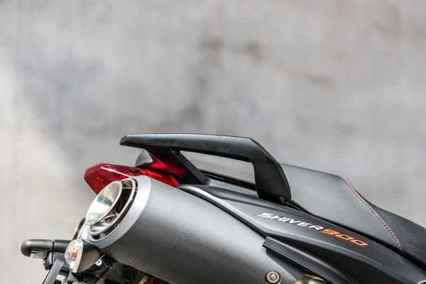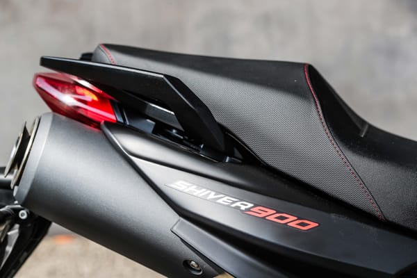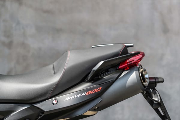 Another characterizing element of Aprilia Shiver, the exhaust, has been redesigned: while maintaining the position under the saddle that contributes to an extremely clean side view of the bike, the terminal part of the silencer is now shorter and aimed upward. A brand new exhaust bottom made up of concentric rings ends in a concave disc: a further bold stylistic element that makes the Shiver immediately recognizable even from the rear, as well as being a practical way to send the exhaust fumes downward, thereby avoiding interference with the passenger and ensuring greater comfort.