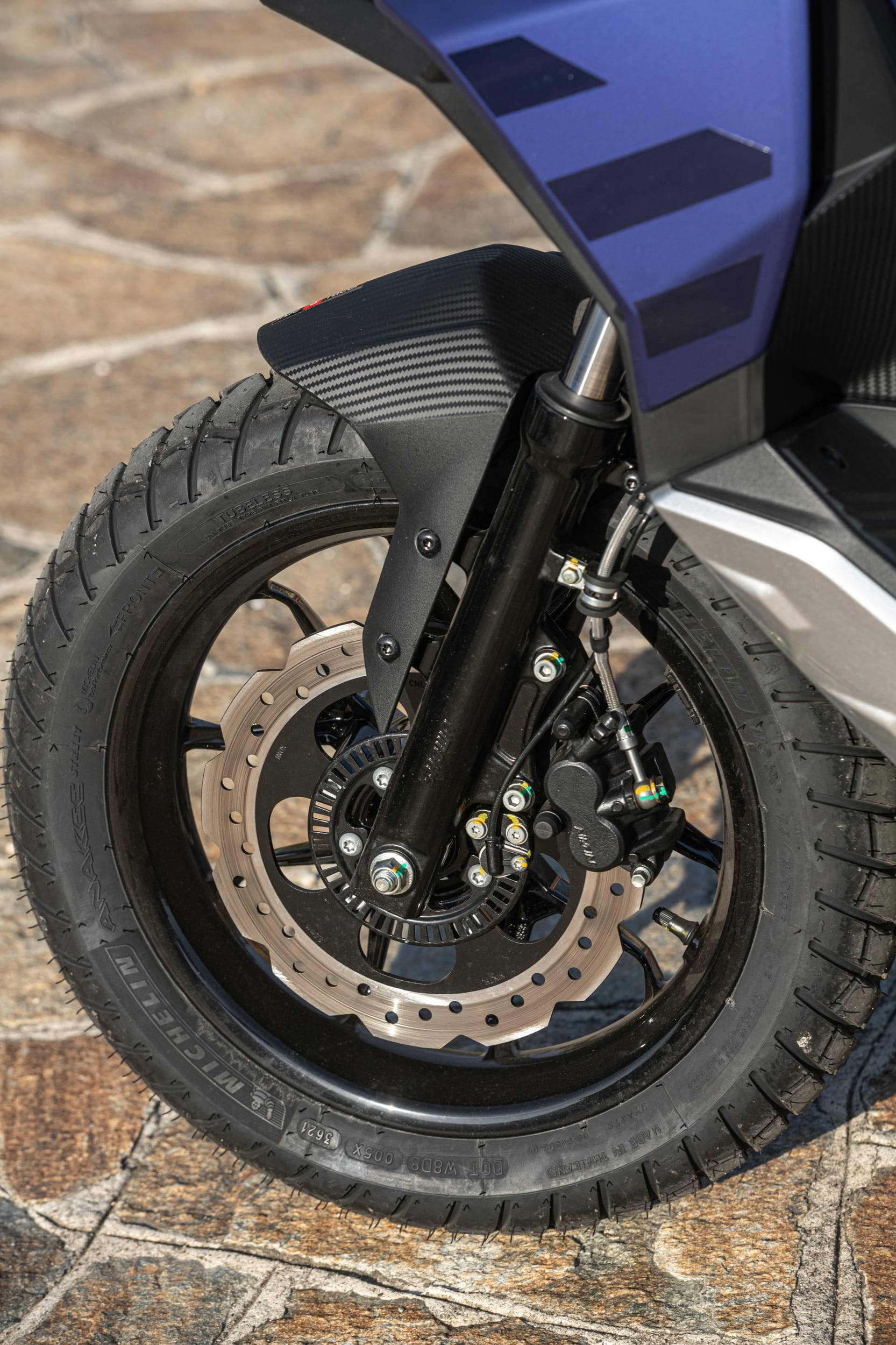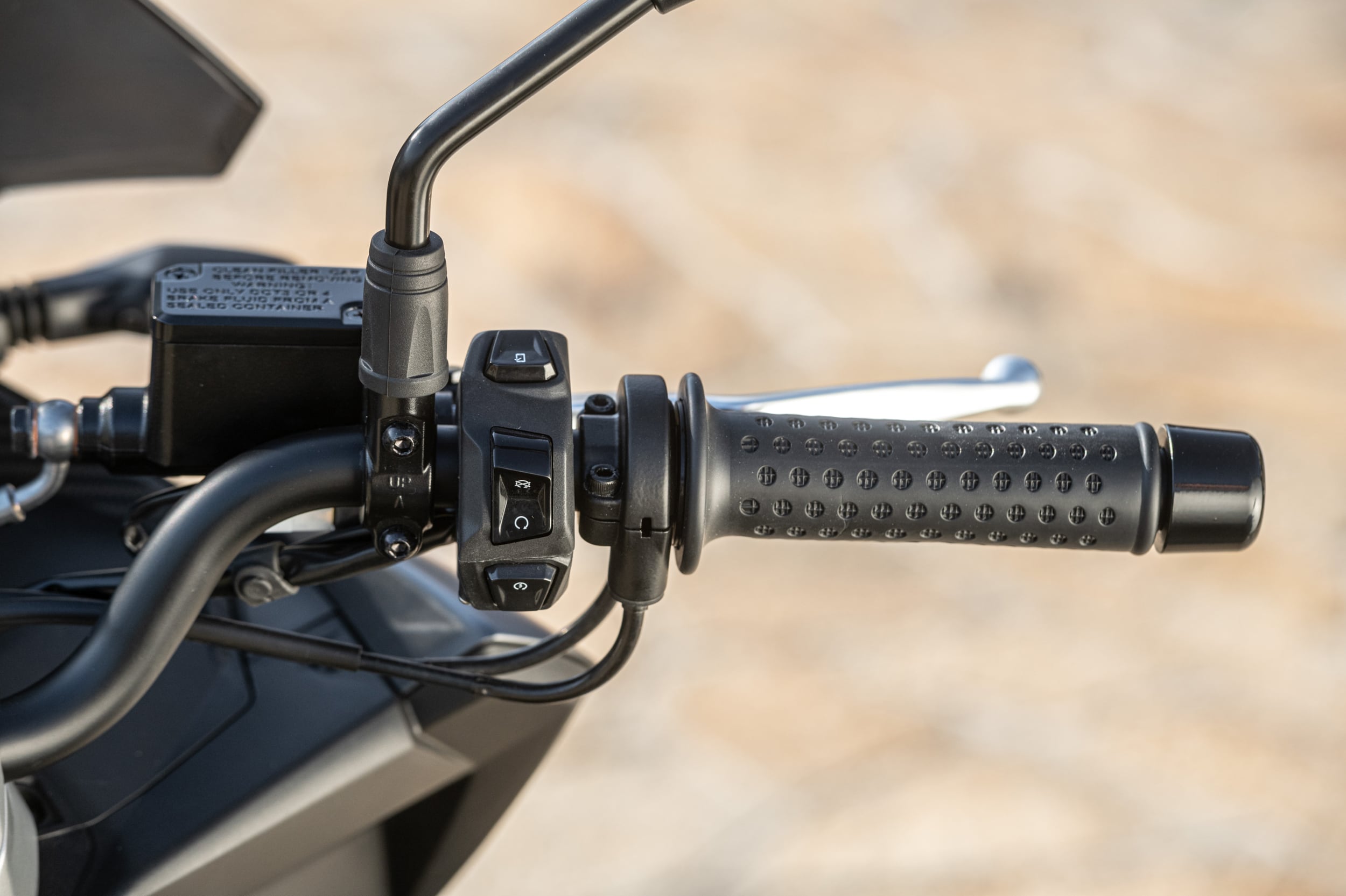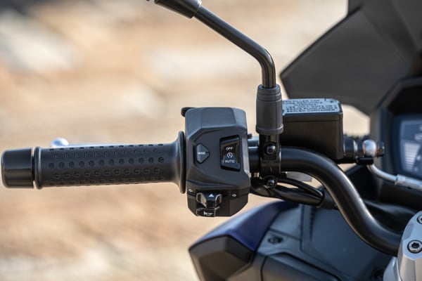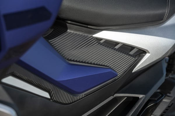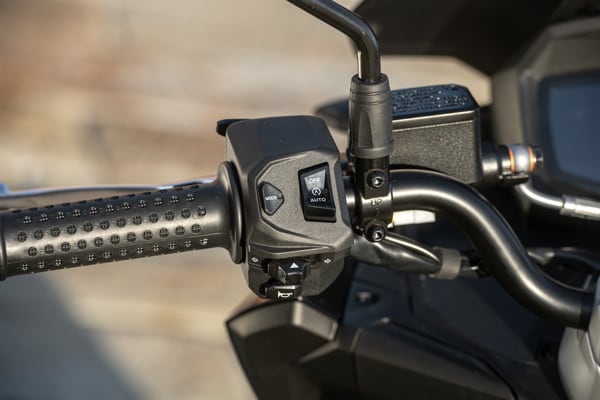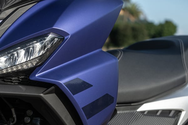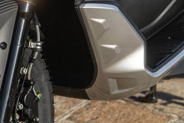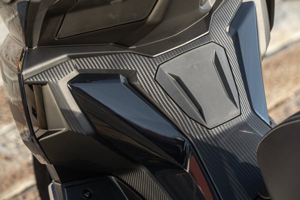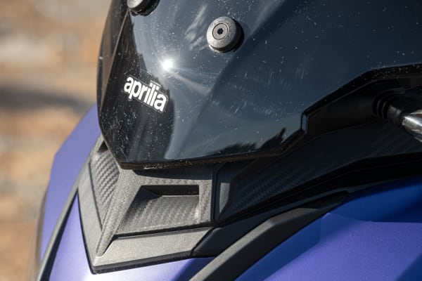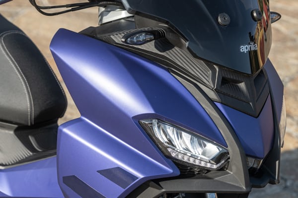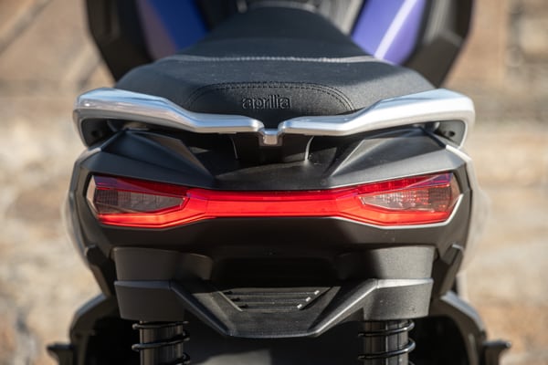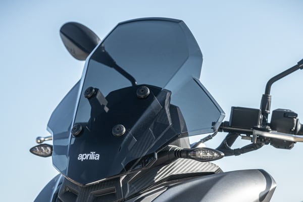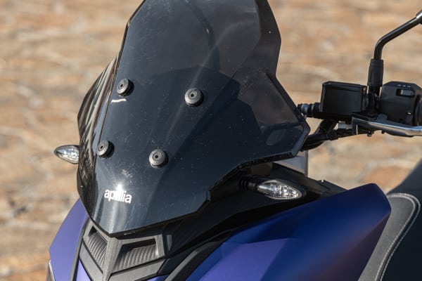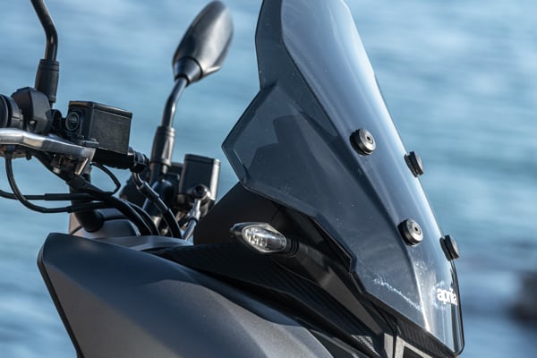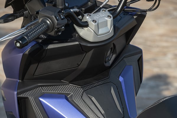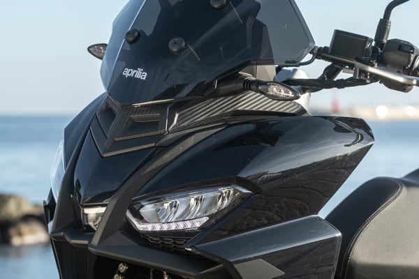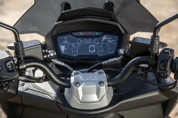 Standing out at the front is the full LED three-element light cluster, typical of Aprilia by Noale sports bikes, as well as the double fairing that emerges to the sides of the shield, but there is also a clear enduro influence, with the suspended windscreen and wide, naked handlebar that contributes to a sense of total control, particularly when manoeuvring at low speed in city traffic. The handlebar is fixed to the vehicle with a refined die-cast aluminium riser that bears the Aprilia logo, while the ergonomic and intuitive handlebar control sets are clearly motorcycle-derived.