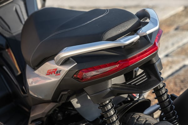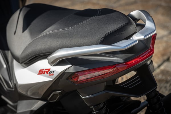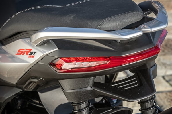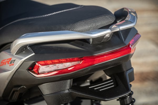 Side-on, Aprilia SR GT is compact, with reduced overhang and taut, dynamic lines that emphasise its sports nature. As well as housing the tank, the central tunnel serves to connect the front and rear, giving SR GT the appearance of a motorcycle. Added to this is the licence plate, which is positioned on the rear wheel to leave a slimmer tail section. Perfectly integrated into the design, the passenger grab handles and full LED rear light cluster complete with turn signals also make an impression.