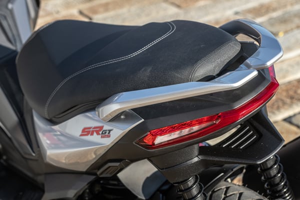 Aprilia SR GT is available in three colours, Aprilia Black, Street Grey and Infinity Blue, each paired with silvery grey footpegs, sides and passenger grab handles. The wheels are black, the saddle black with grey stitching.