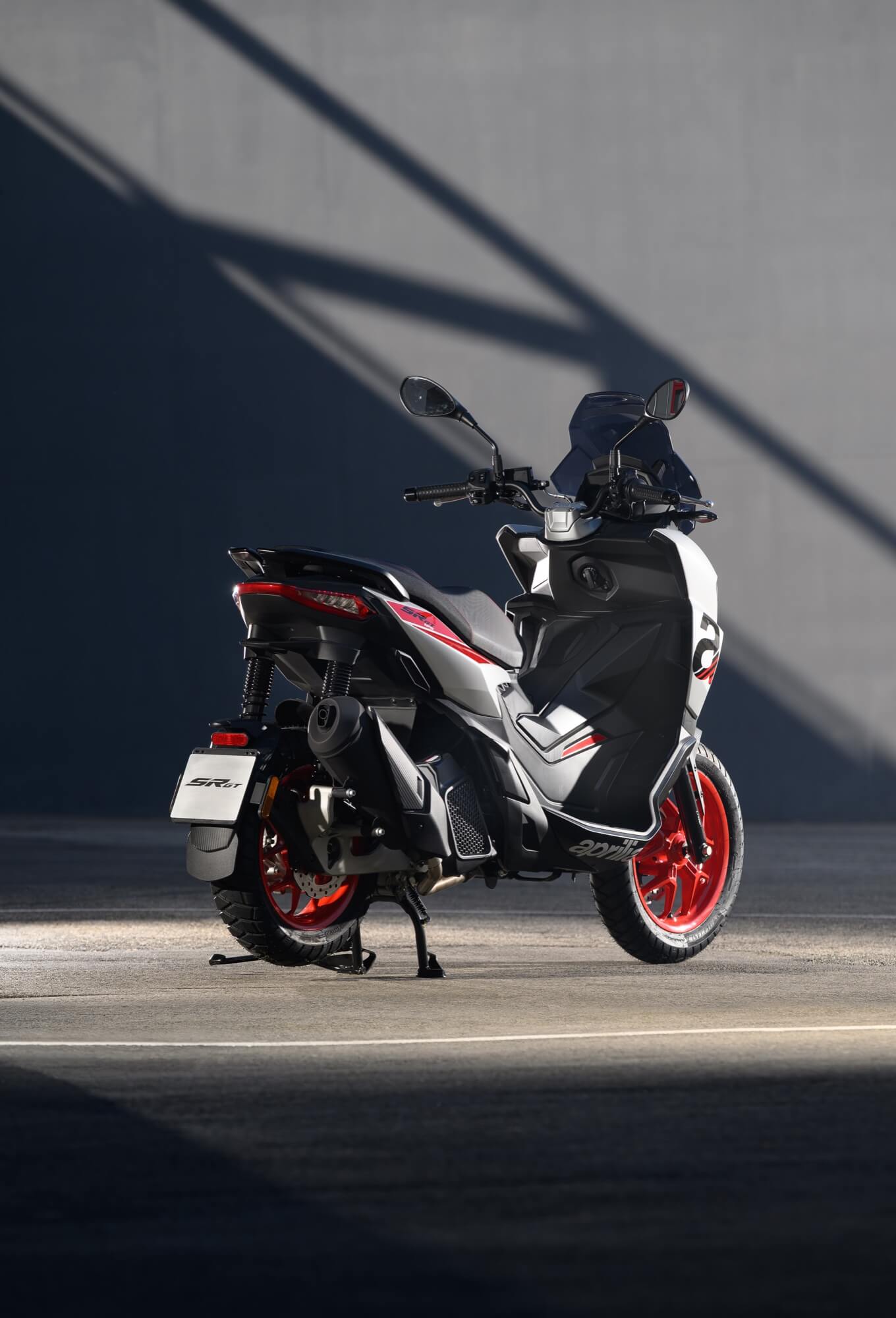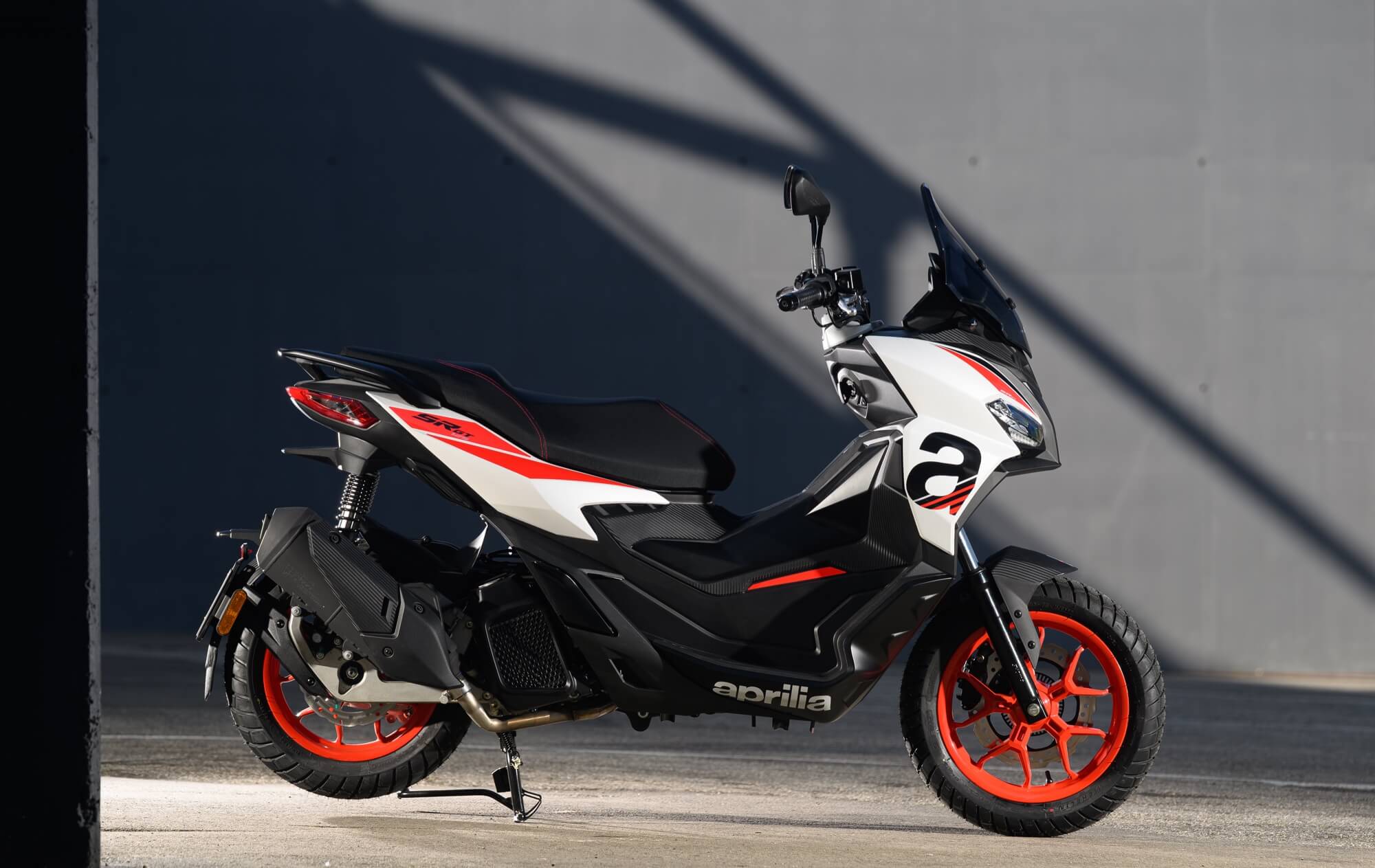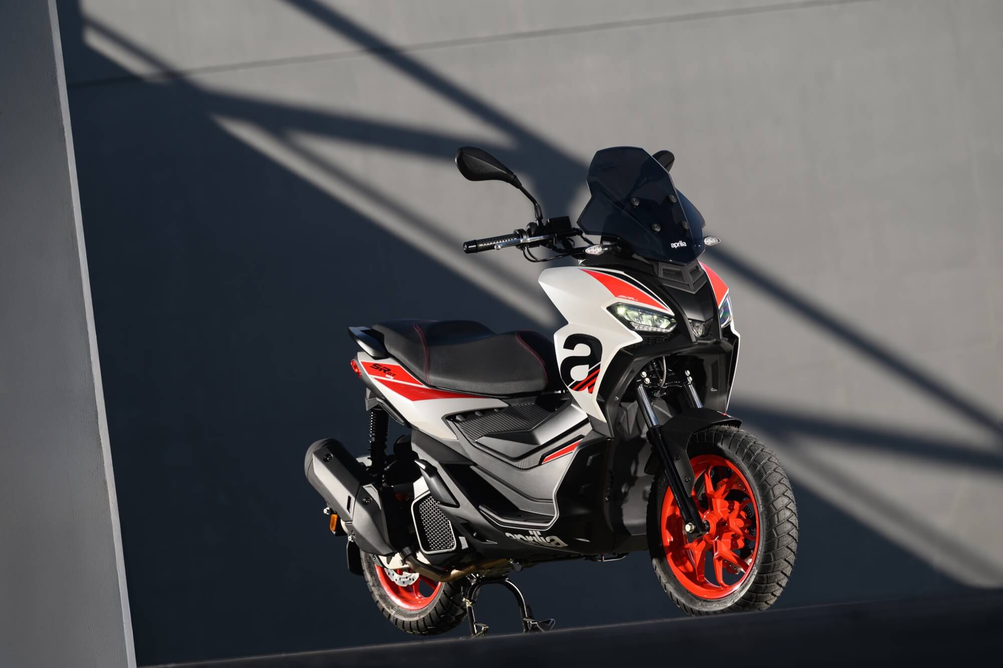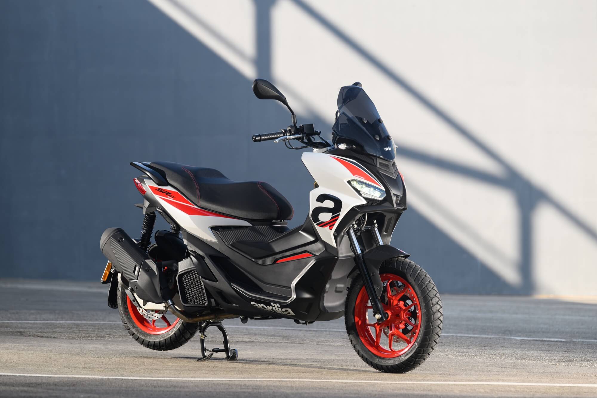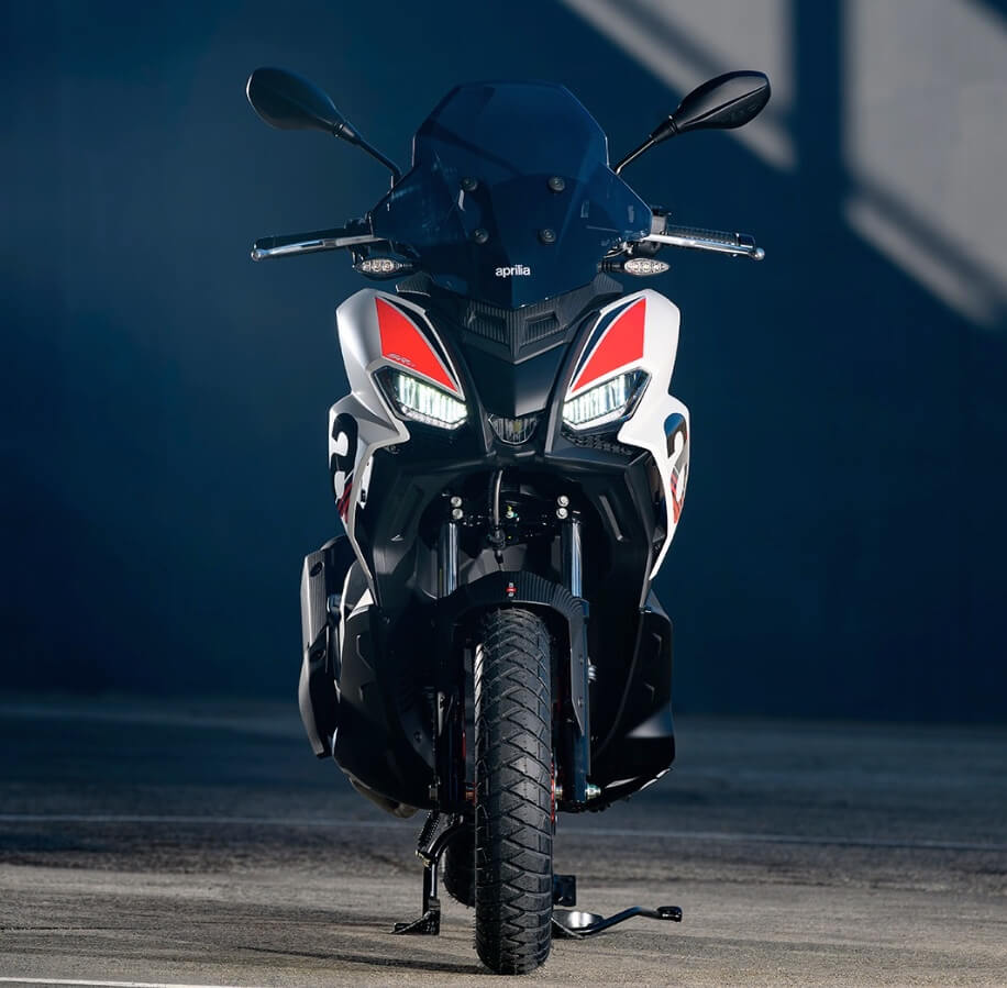 The Sport version comes even closer to the typical liveries of Aprilia sports bikes, with the Red Raceway, Savana Grey and Space White colour versions, which are combined with red-painted wheels and a black dual-cover saddle with red stitching. The foot board, passenger handles and central tunnel are matte black. The set-up is completed by bold red details and a large Aprilia ‘A’ on either side of the shield.