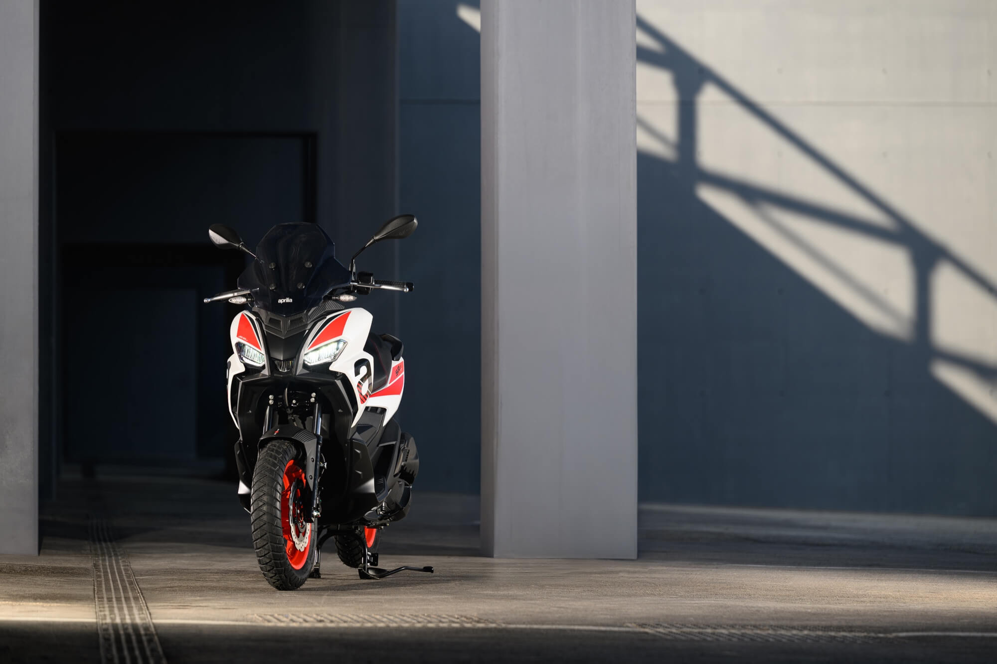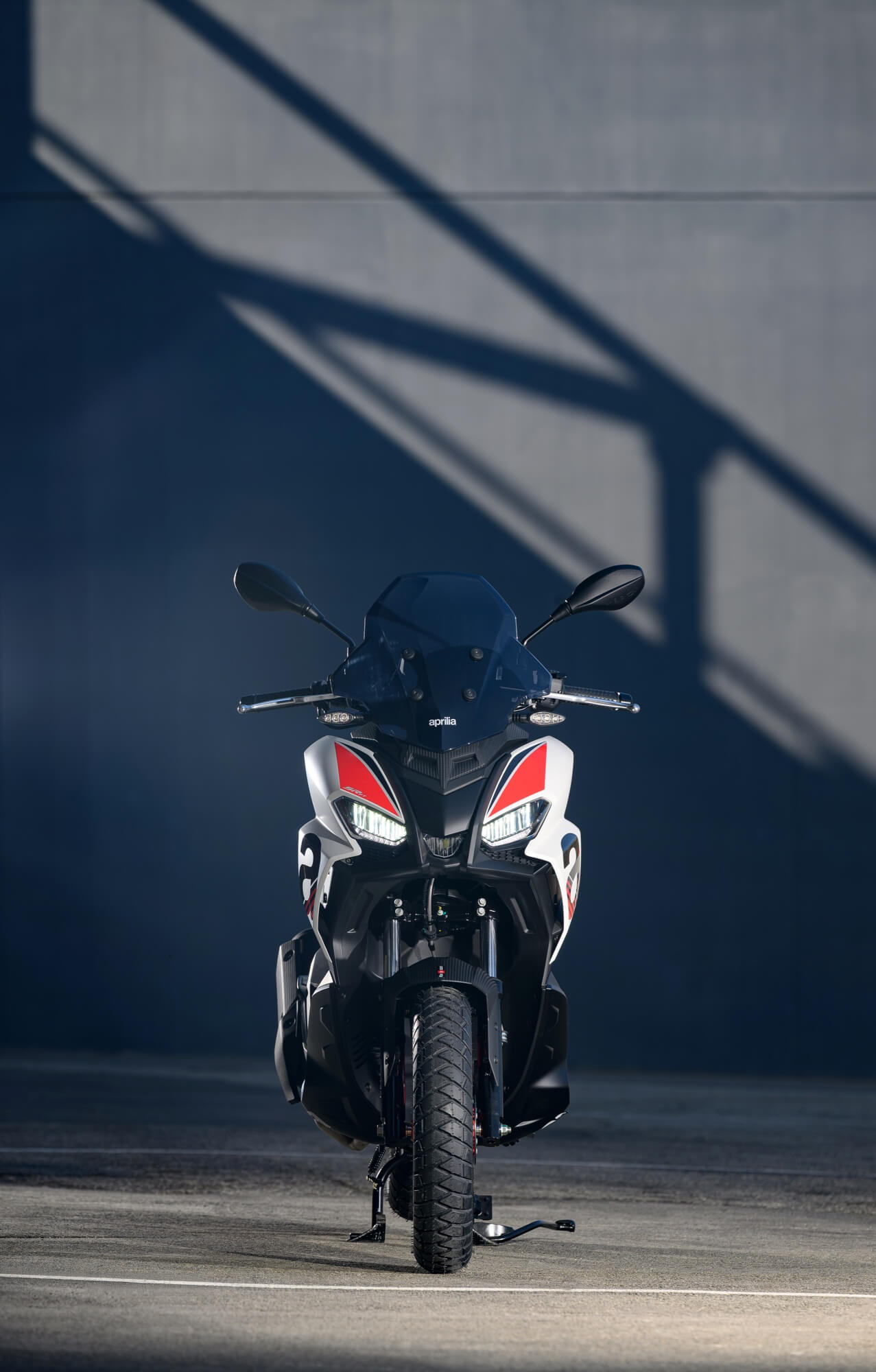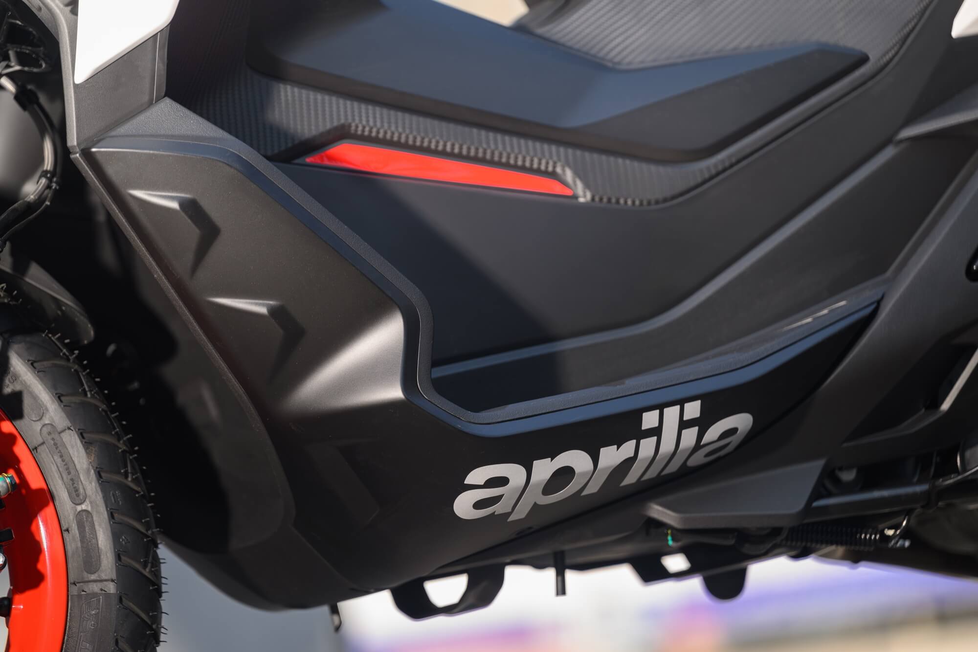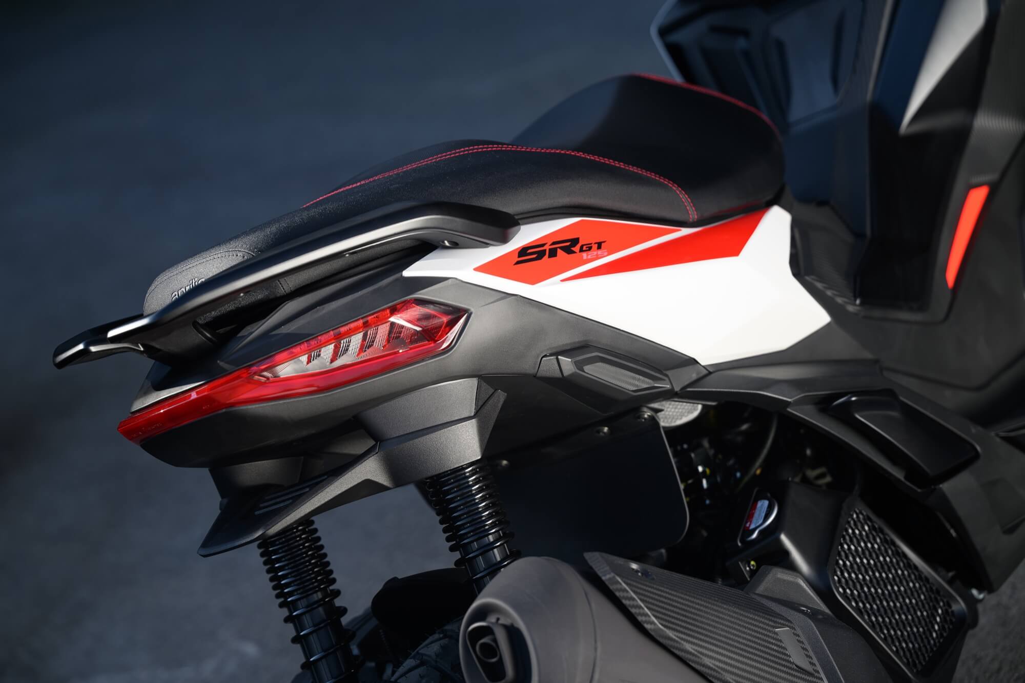 The Sport version comes even closer to the typical liveries of Aprilia sports bikes, with the Red Raceway, Savana Grey and Space White colour versions, which are combined with red-painted wheels and a black dual-cover saddle with red stitching. The foot board, passenger handles and central tunnel are matte black. The set-up is completed by bold red details and a large Aprilia ‘A’ on either side of the shield.