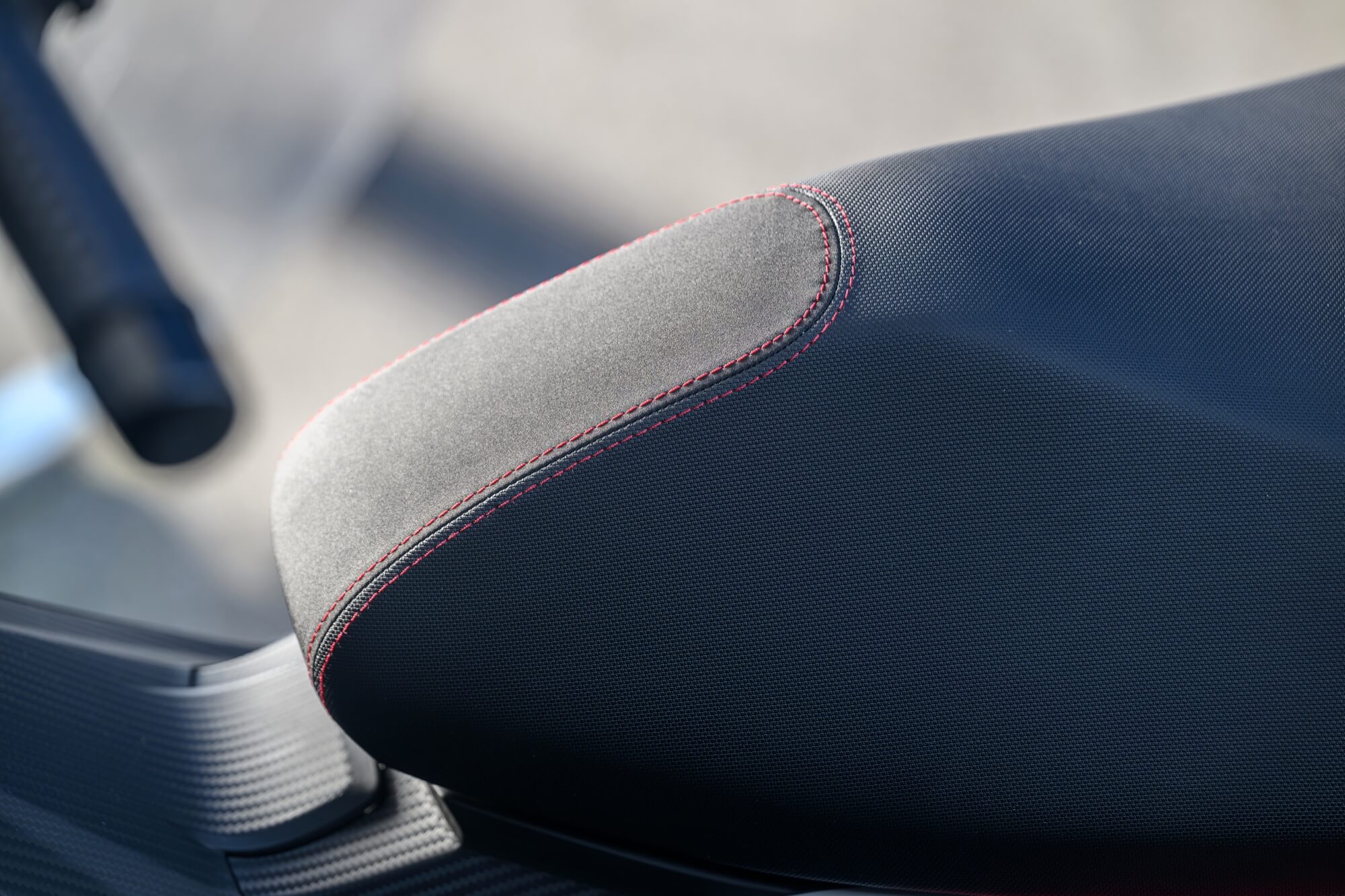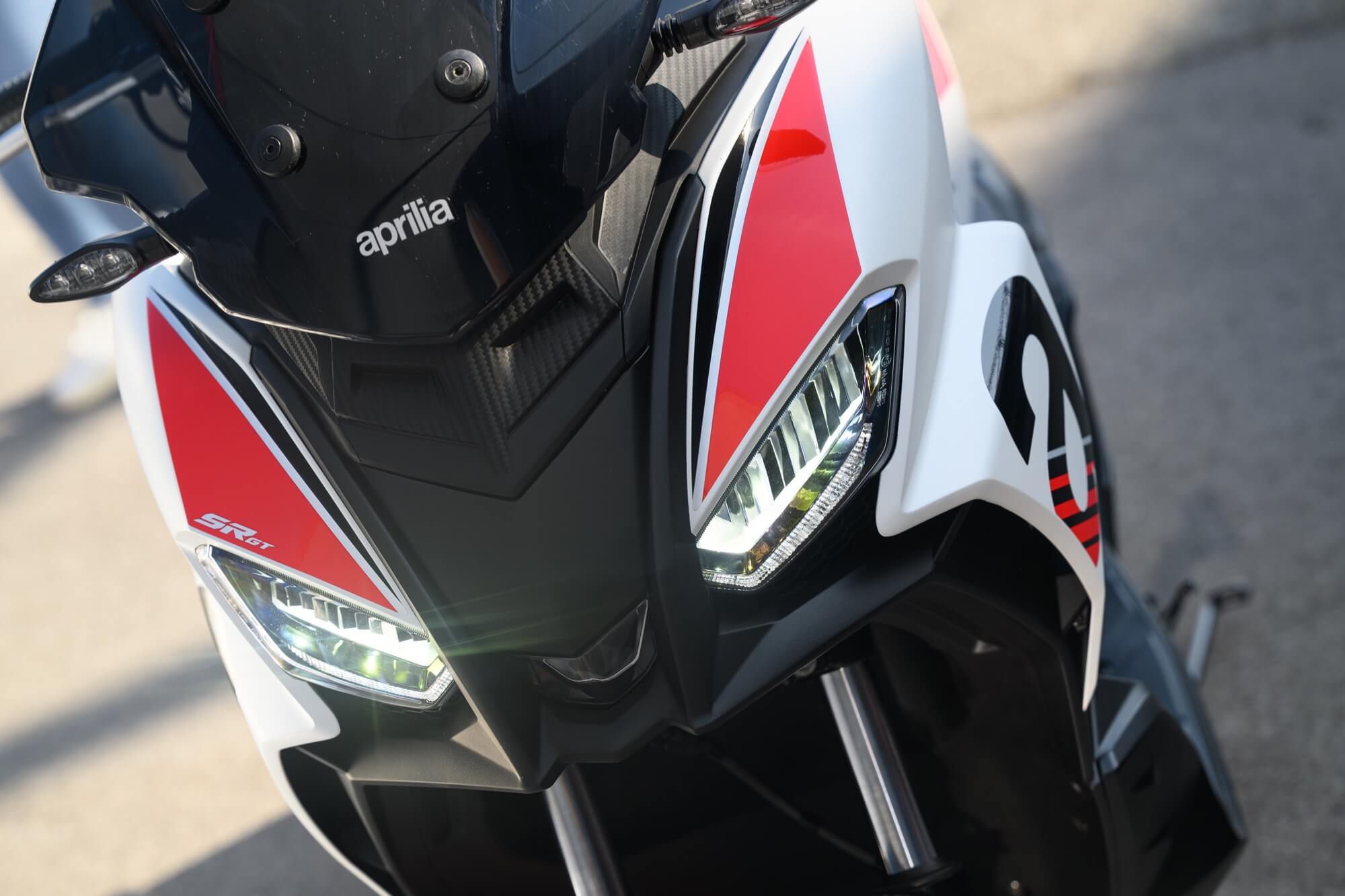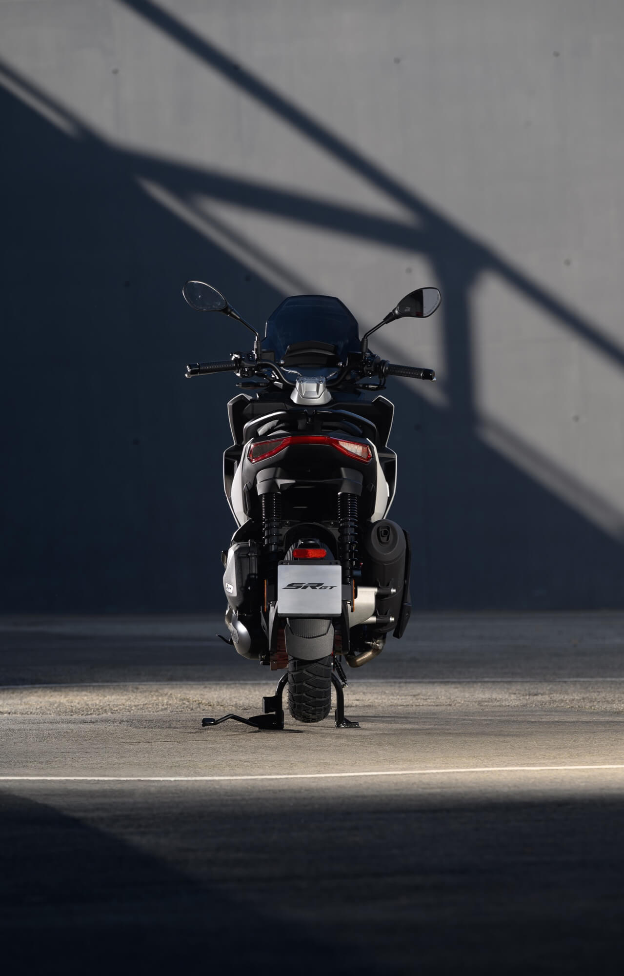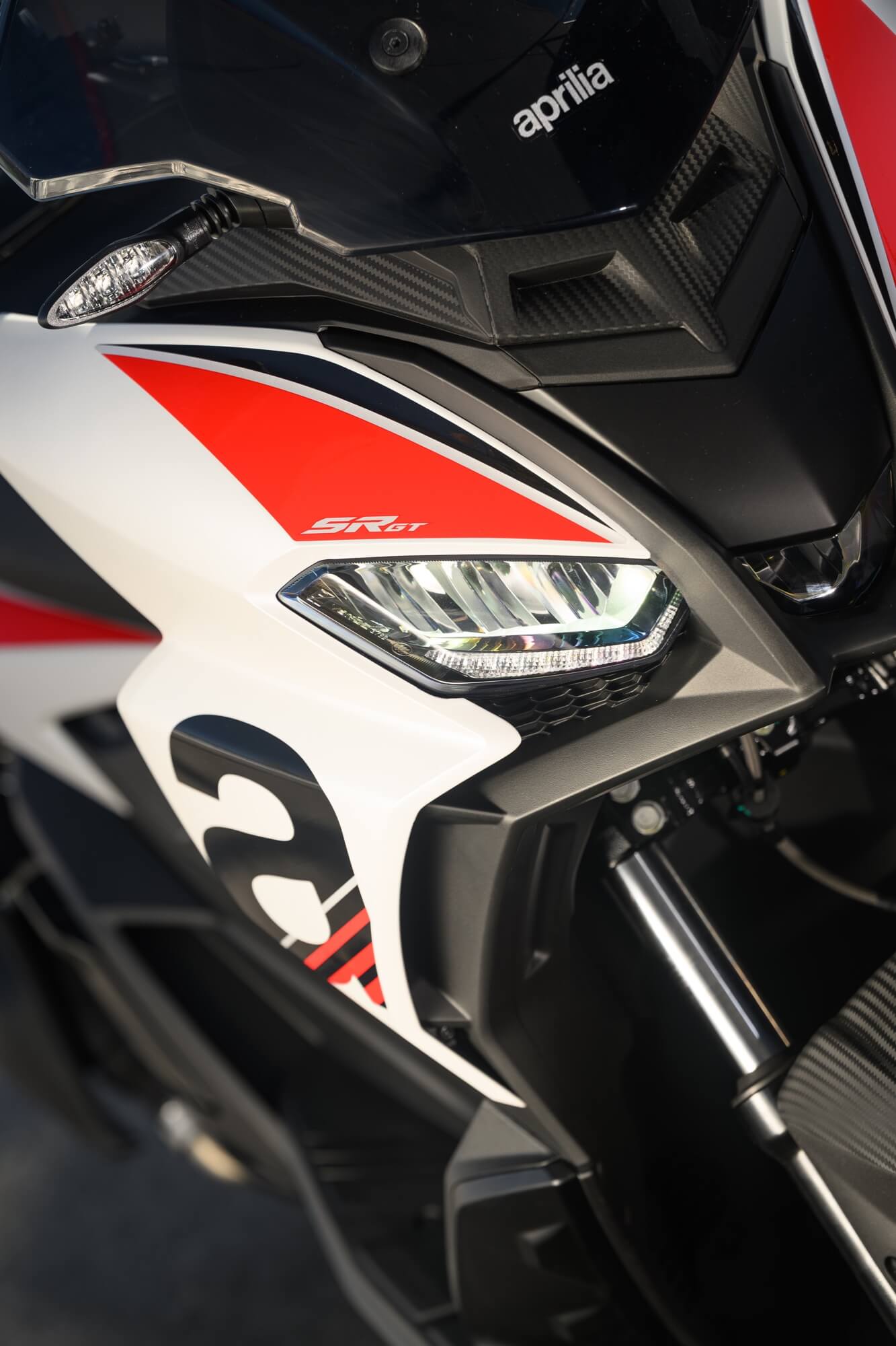 The Sport version comes even closer to the typical liveries of Aprilia sports bikes, with the Red Raceway, Savana Grey and Space White colour versions, which are combined with red-painted wheels and a black dual-cover saddle with red stitching. The foot board, passenger handles and central tunnel are matte black. The set-up is completed by bold red details and a large Aprilia ‘A’ on either side of the shield.