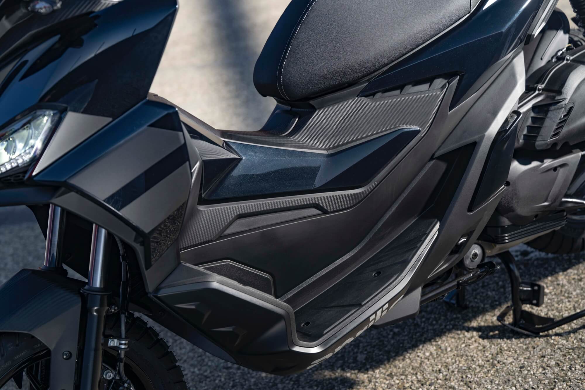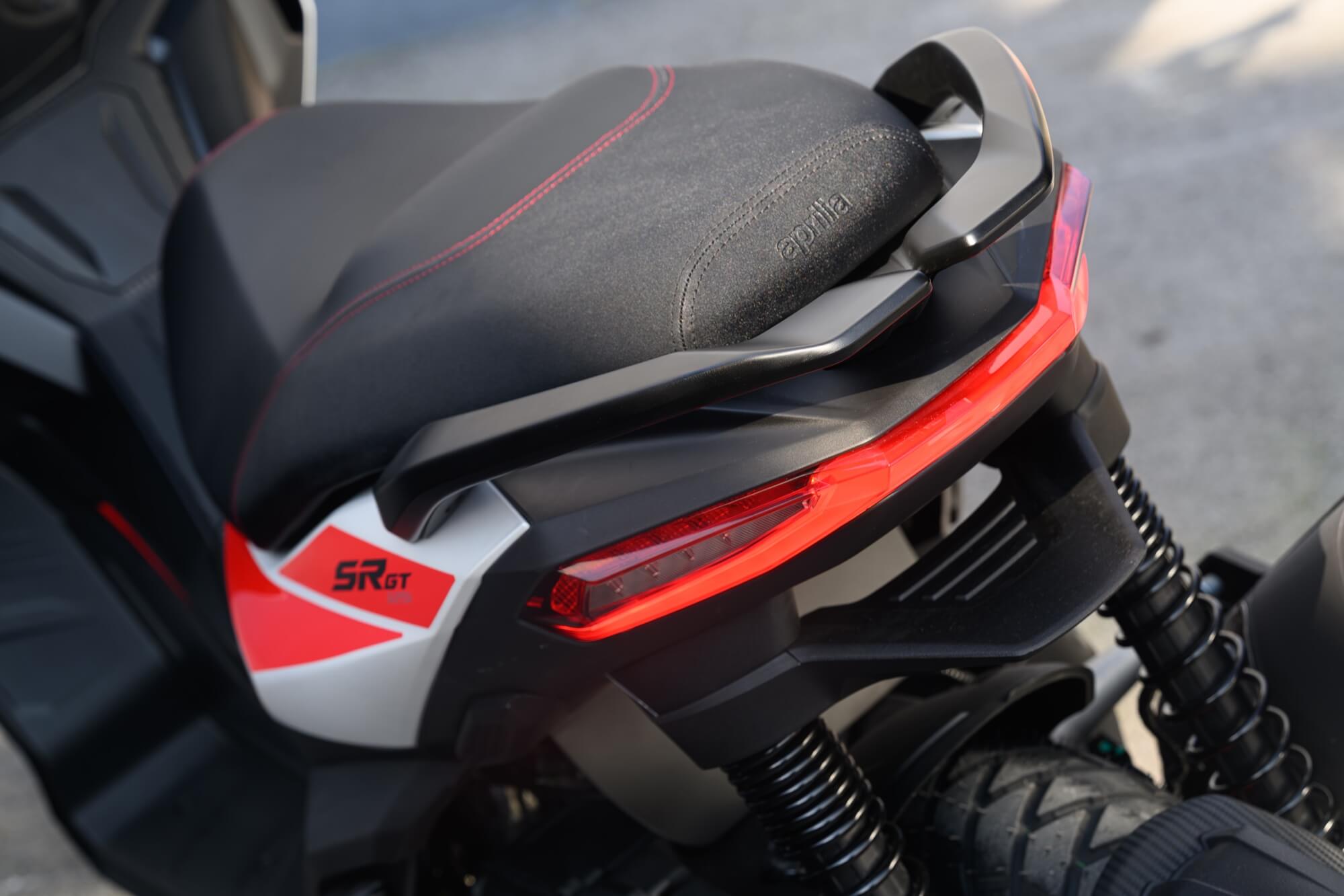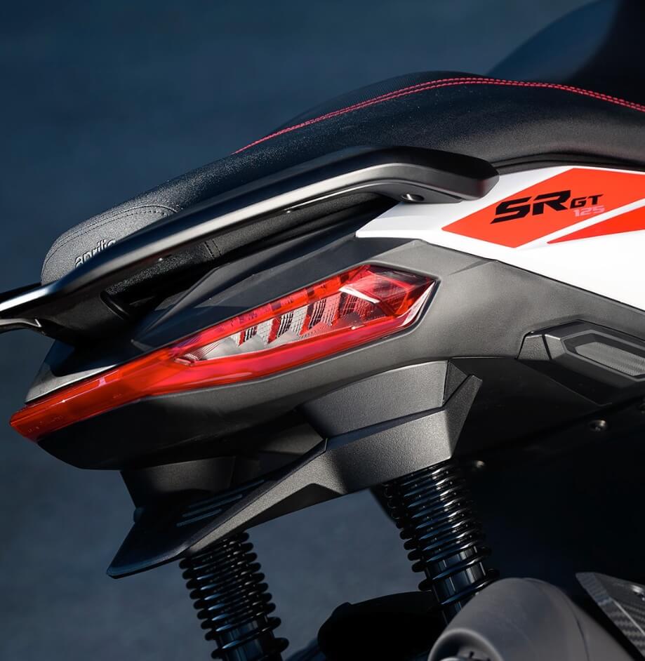 A unique style, with sports lines and a nod to the motorcycle world. The versatility of Aprilia SR GT is immediately clear from its style details, with strong references to the racing character of Aprilia sports bikes, but also the off-road world. Side-on, Aprilia SR GT is compact, with reduced overhang and taut, dynamic lines that emphasise its sports nature. As well as housing the tank, the central tunnel serves to connect the front and rear, giving SR GT the appearance of a motorcycle. Added to this is the licence plate, which is positioned on the rear wheel to leave a slimmer tail section. Perfectly integrated into the design, the passenger grab handles and full LED rear light cluster complete with turn signals also make an impression. With the focus firmly on fun, the Aprilia SR GT riding position is less rearward and more "active" with respect to a traditional compact GT scooter. But the rider can adopt a different position, with their feet further forward on the footpegs, for a more relaxed riding style that is less tiring over long distances. This is possible thanks to an ergonomic footpeg, the external part of which resembles the shape of the protective plates on off-road bikes.