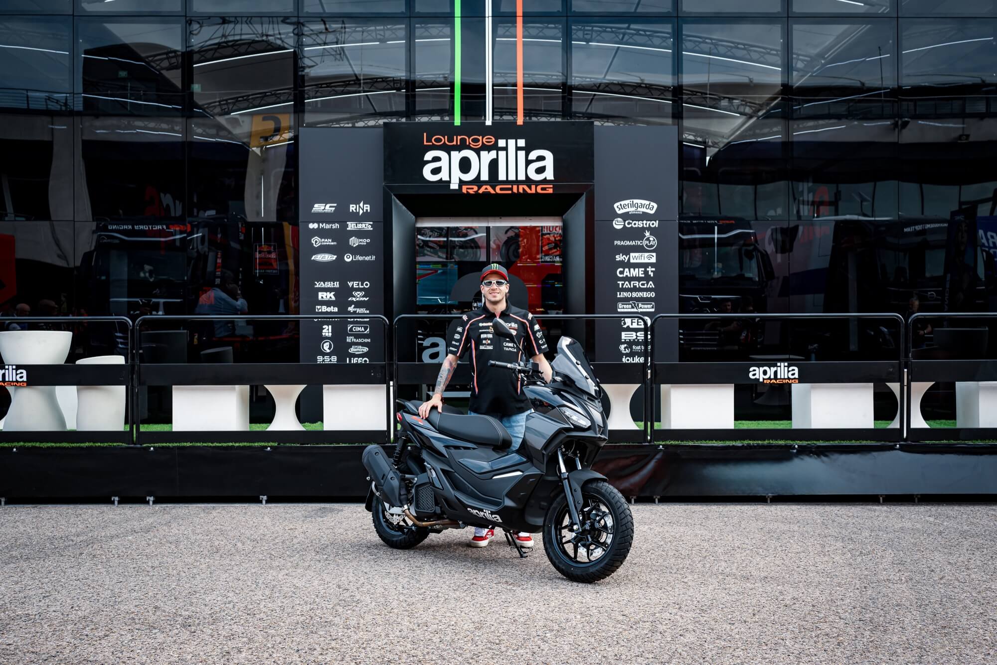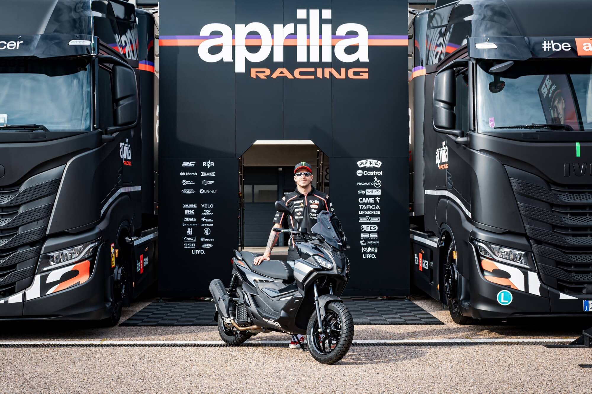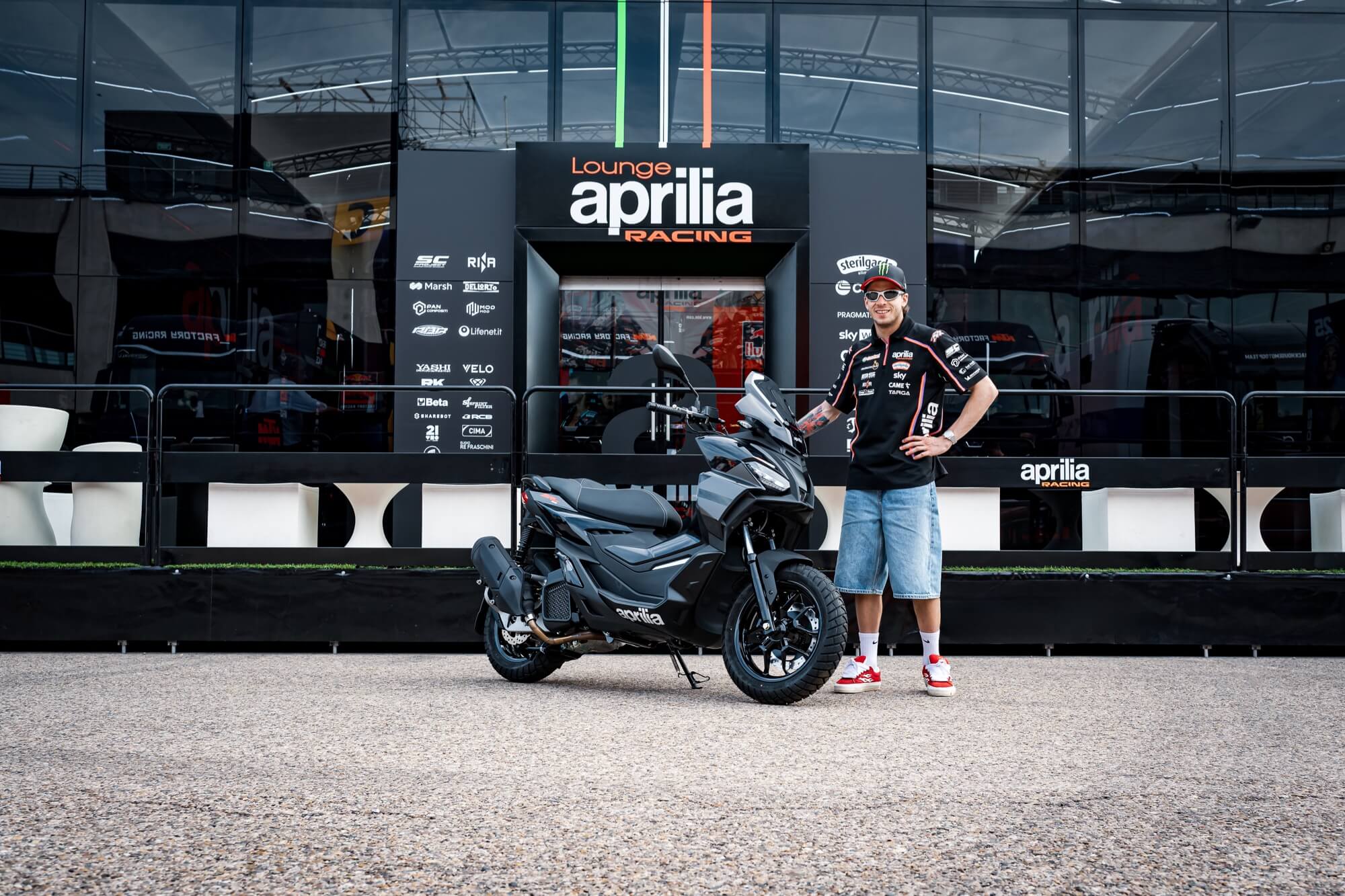 Aprilia Racing MotoGP rider Marco Bezzecchi & Aprilia SR GT (E5+), MY 2025, Aprilia Black livery.