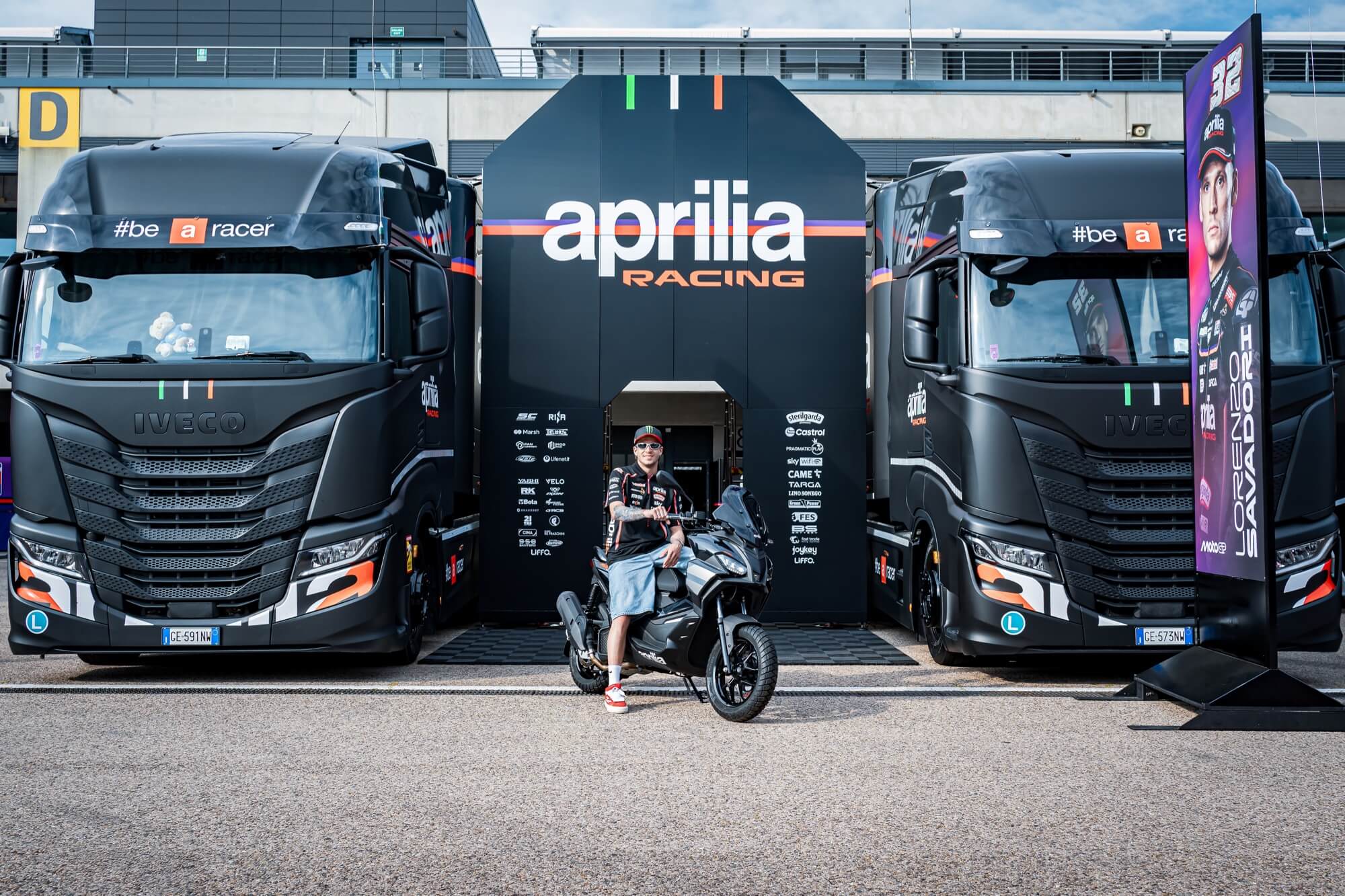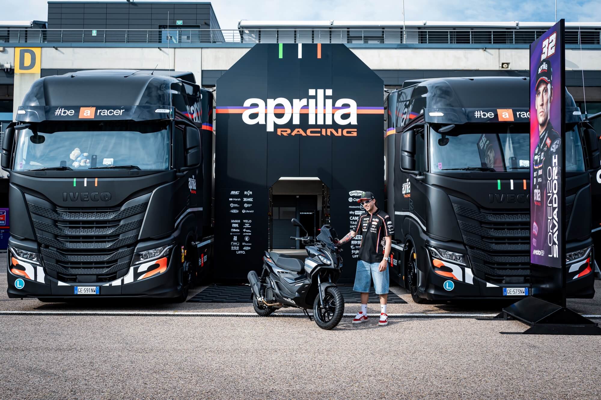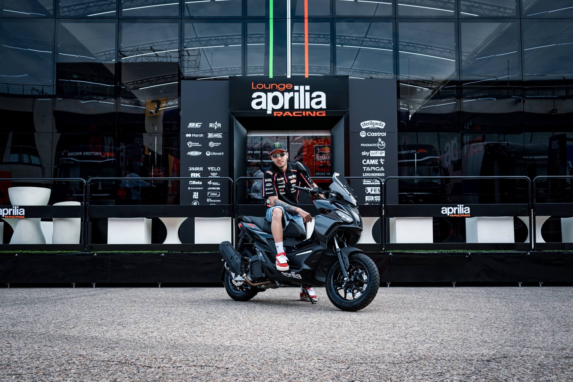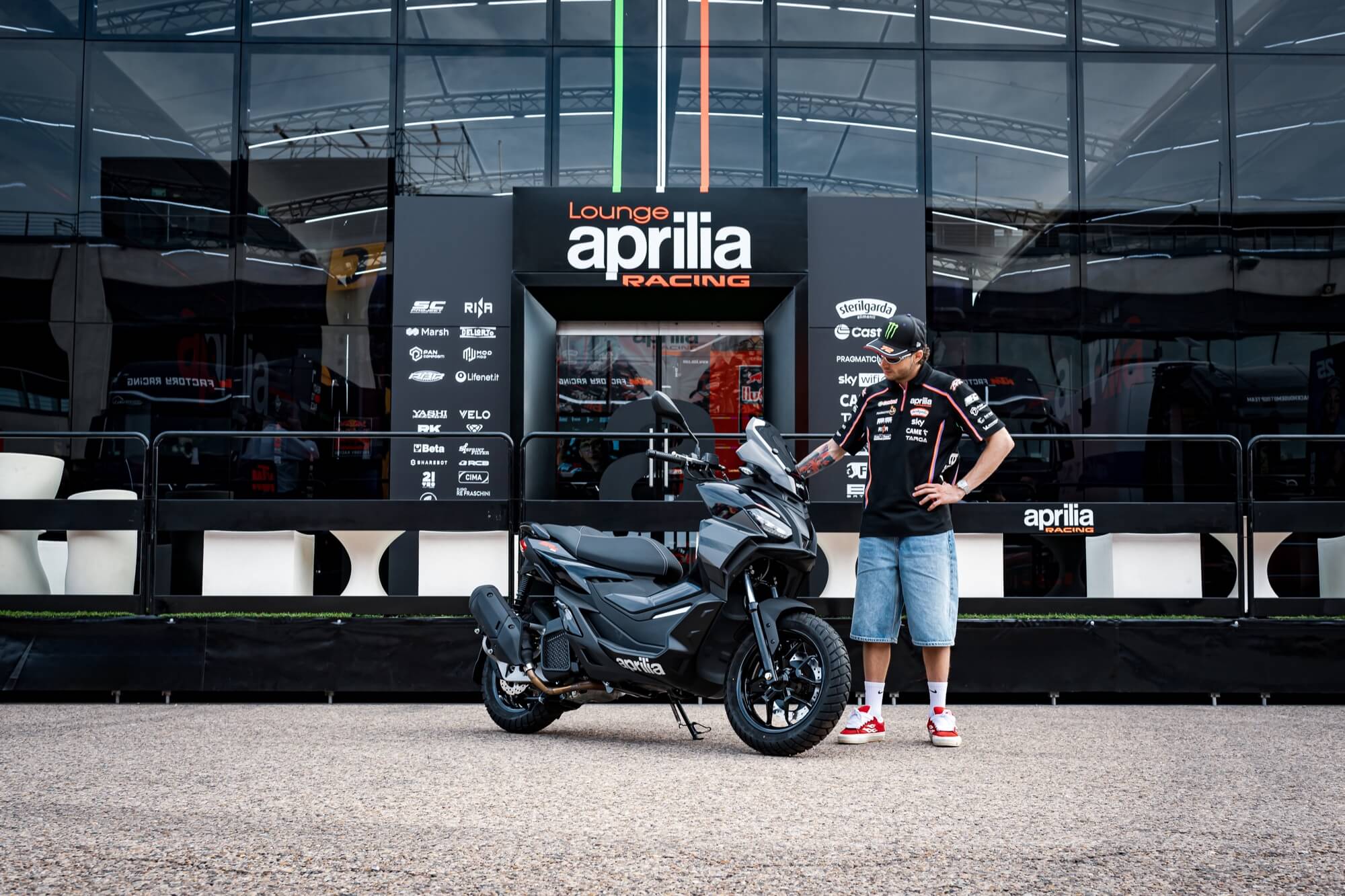 Aprilia Racing MotoGP rider Marco Bezzecchi & Aprilia SR GT (E5+), MY 2025, Aprilia Black livery.