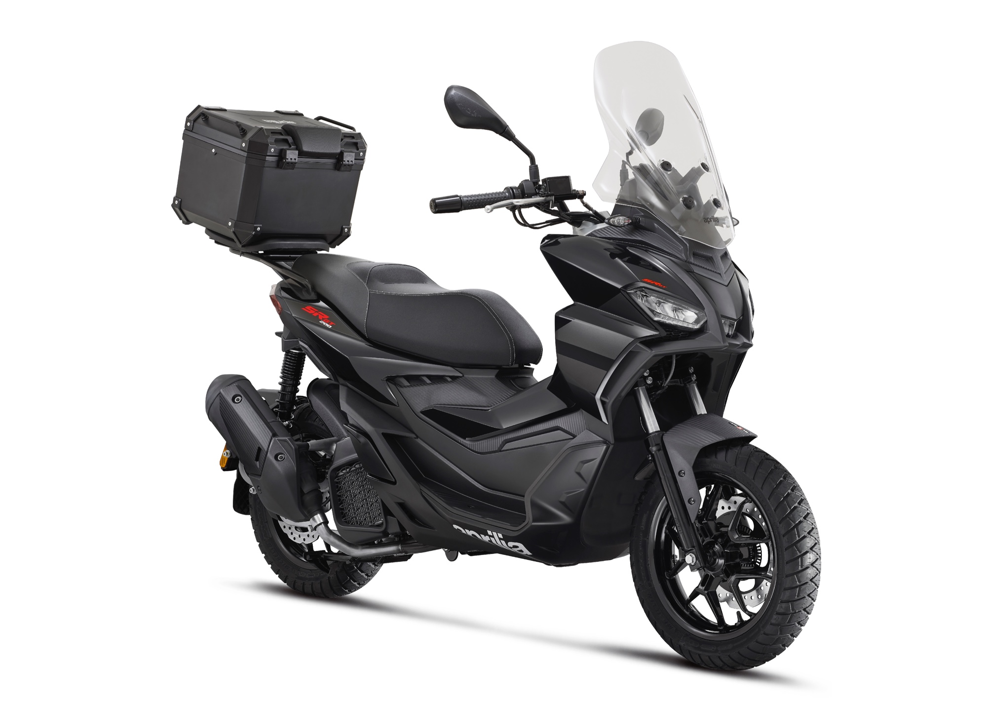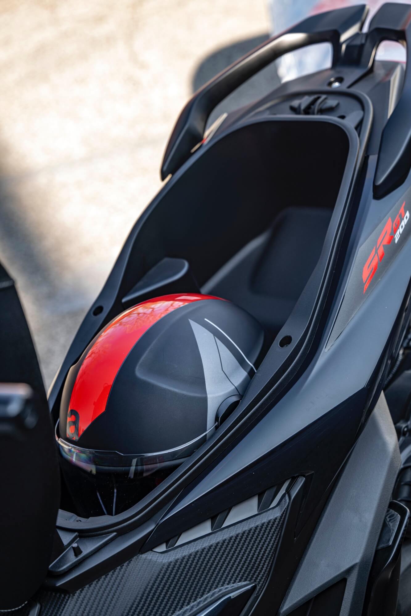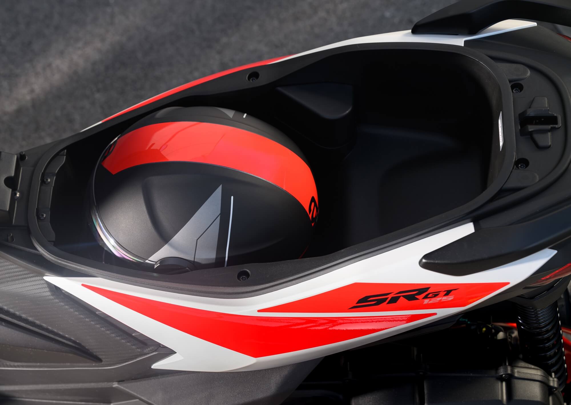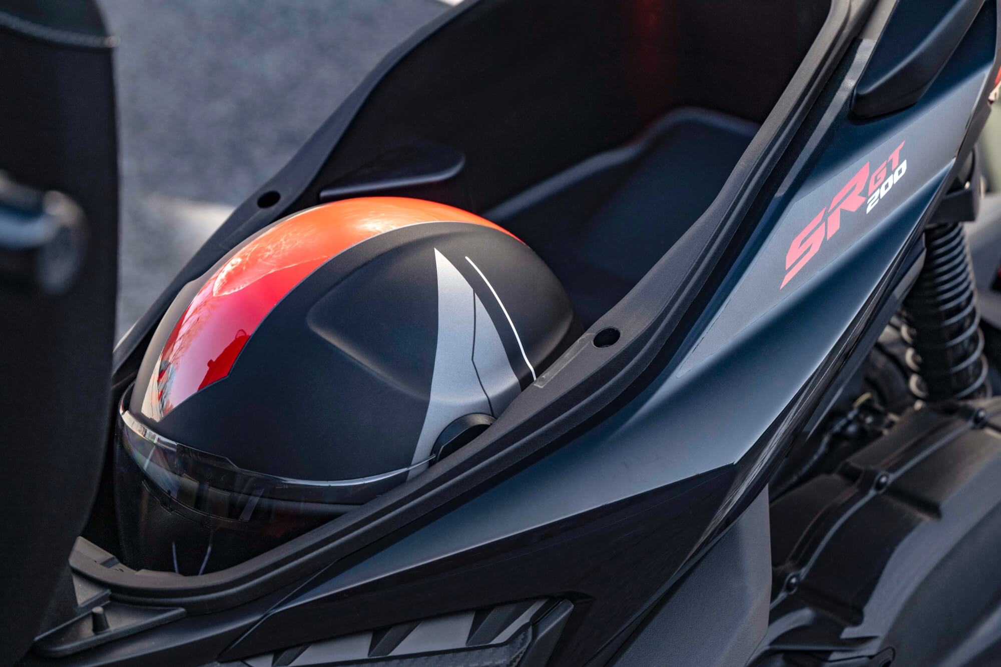 ACCESSORIES. The range of accessories for Aprilia SR GT is designed to increase vehicle comfort and functionality. The large compartment under the saddle can be combined with a 32-litre top box, to further increase the load capacity. The back rest is available separately, as is the practical inner bag, created to suit the shape of the top box. The larger and more protective windscreen incorporates hand guards and is produced in shockproof transparent methacrylate so as to ensure the best protection against atmospheric agents as well as excellent visibility. .