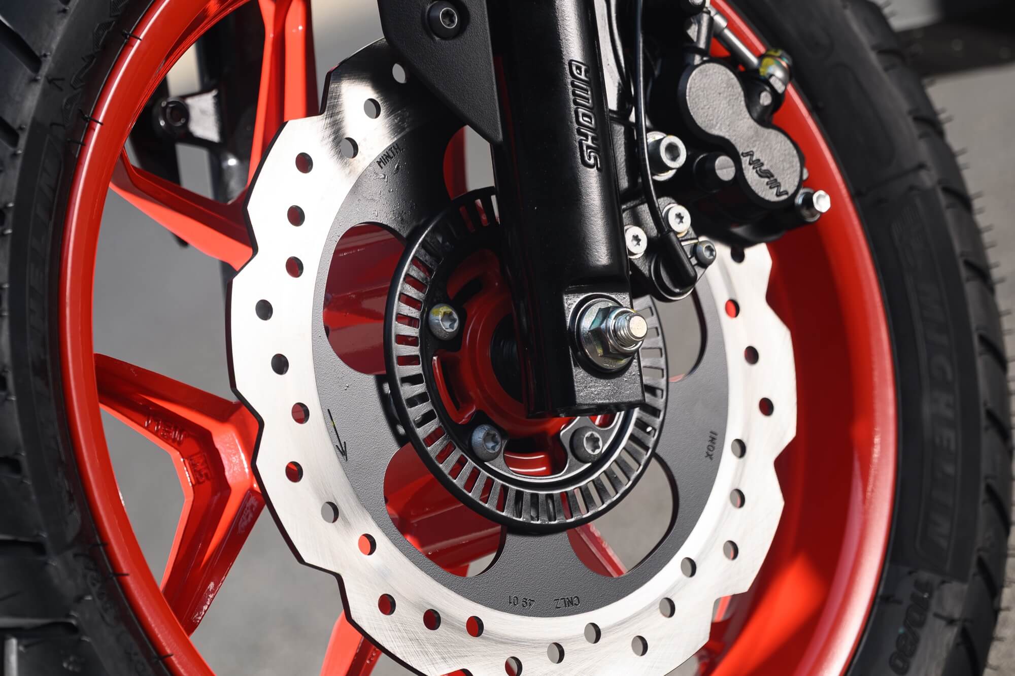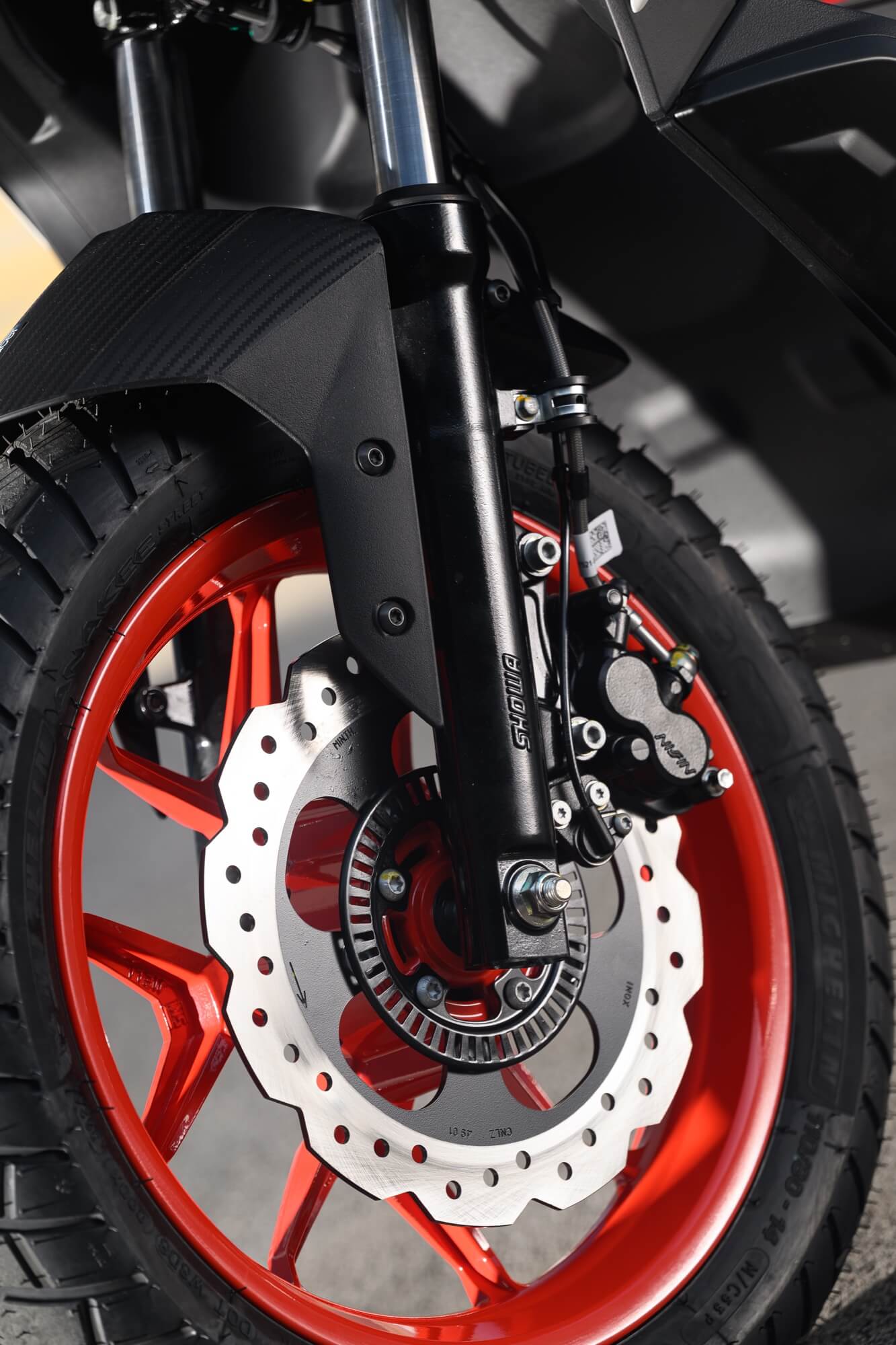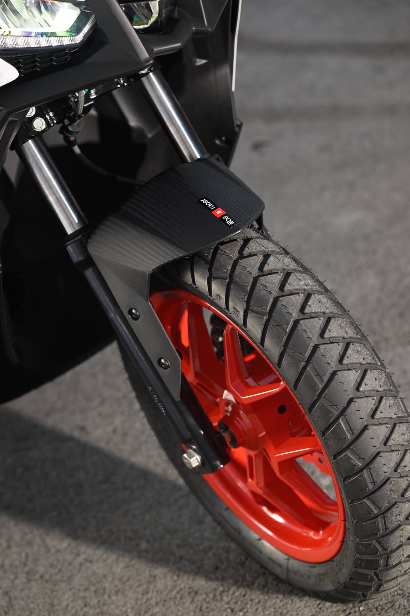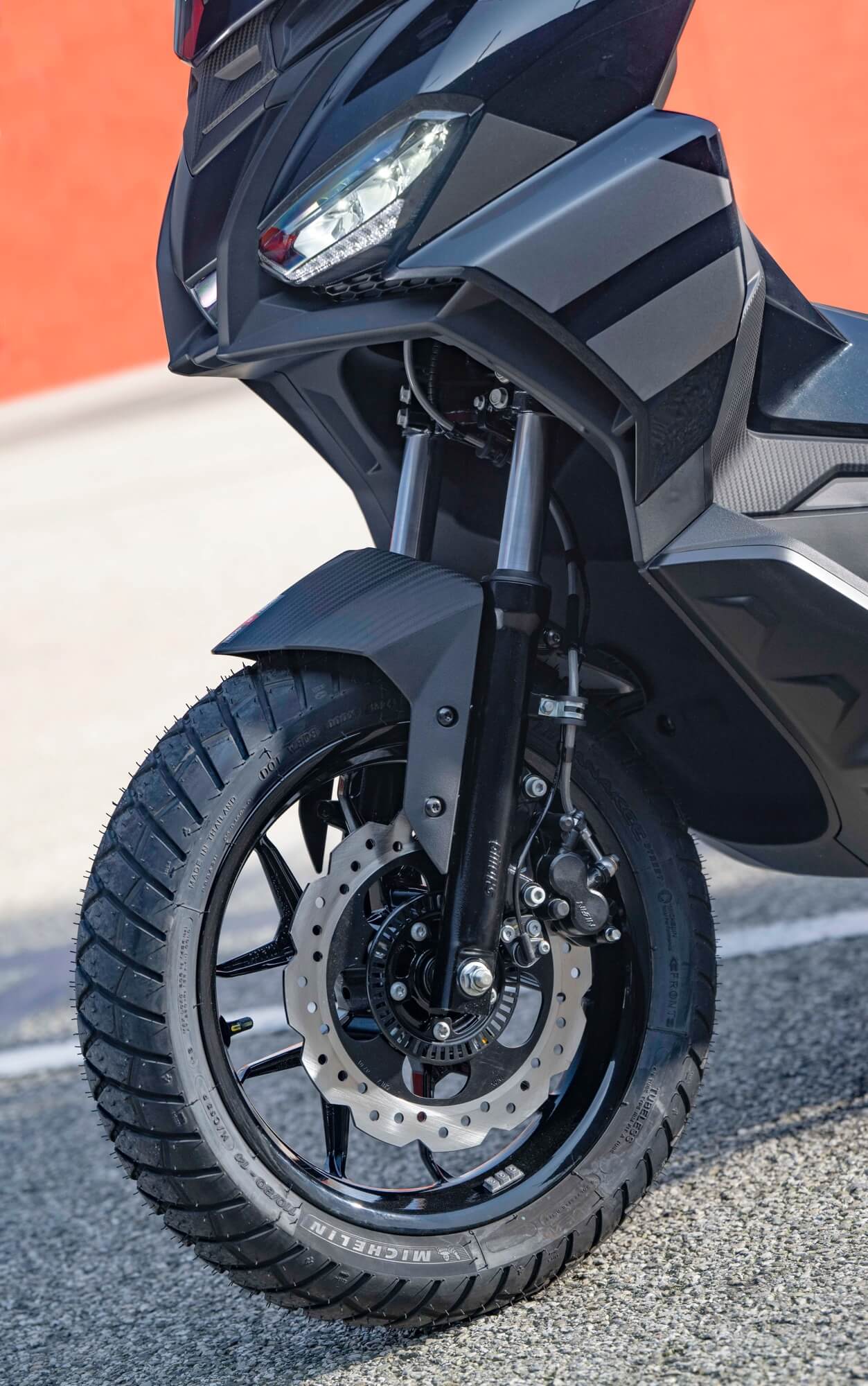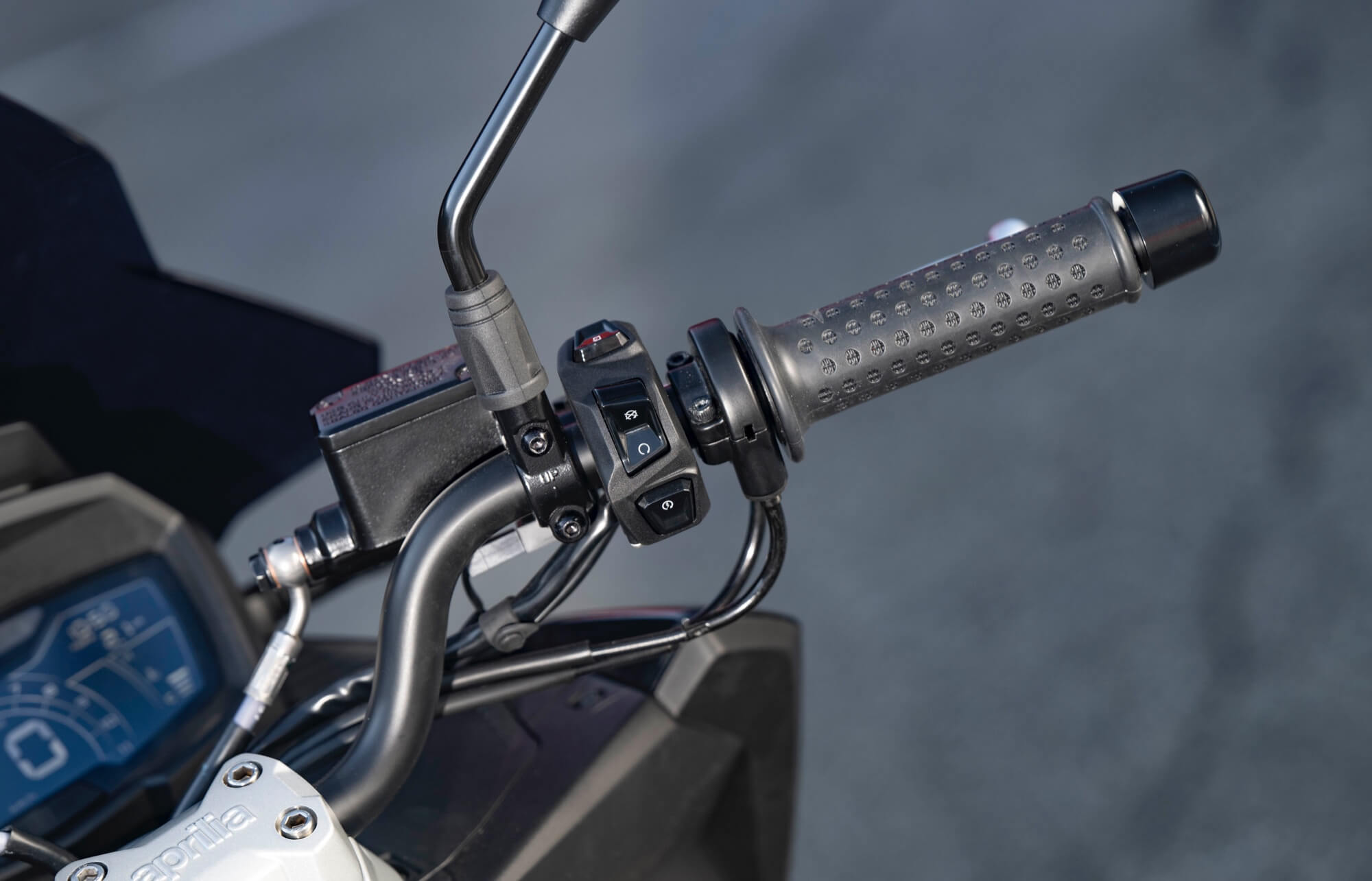 Standing out at the front is the full LED three-element light cluster, typical of Noale sports bikes, as well as the double fairing that emerges to the sides of the shield, but there is also a clear enduro influence, with the suspended windscreen and wide, naked handlebar that contributes to a sense of total control, particularly when manoeuvring at low speed in city traffic. The handlebar is fixed to the vehicle with a refined die-cast aluminium riser that bears the Aprilia logo, while the ergonomic and intuitive handlebar control sets are clearly motorcycle-derived.
