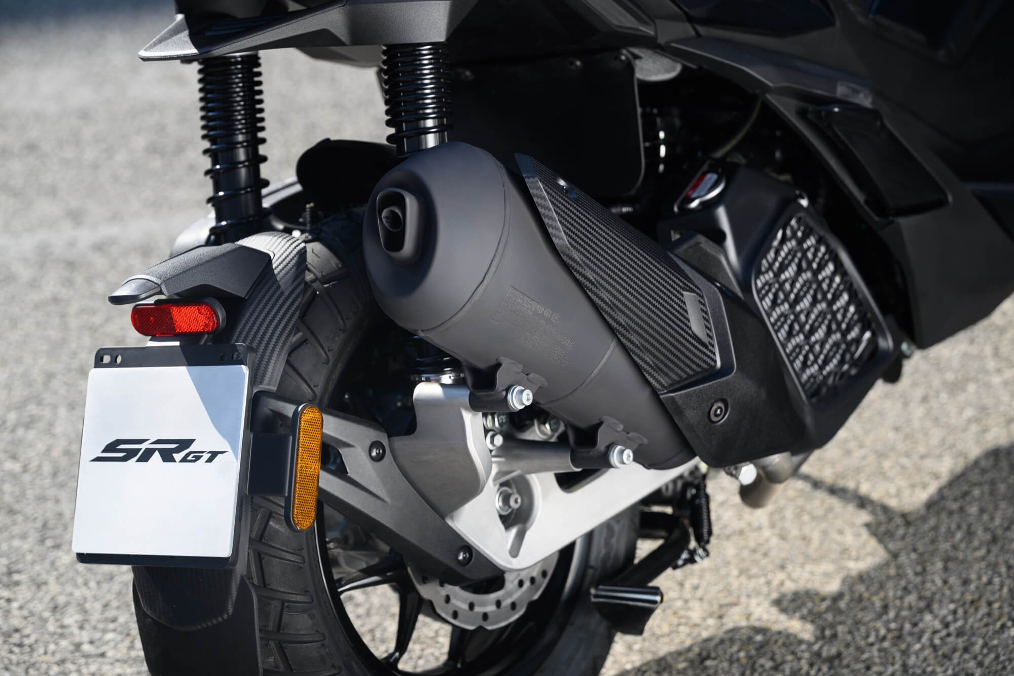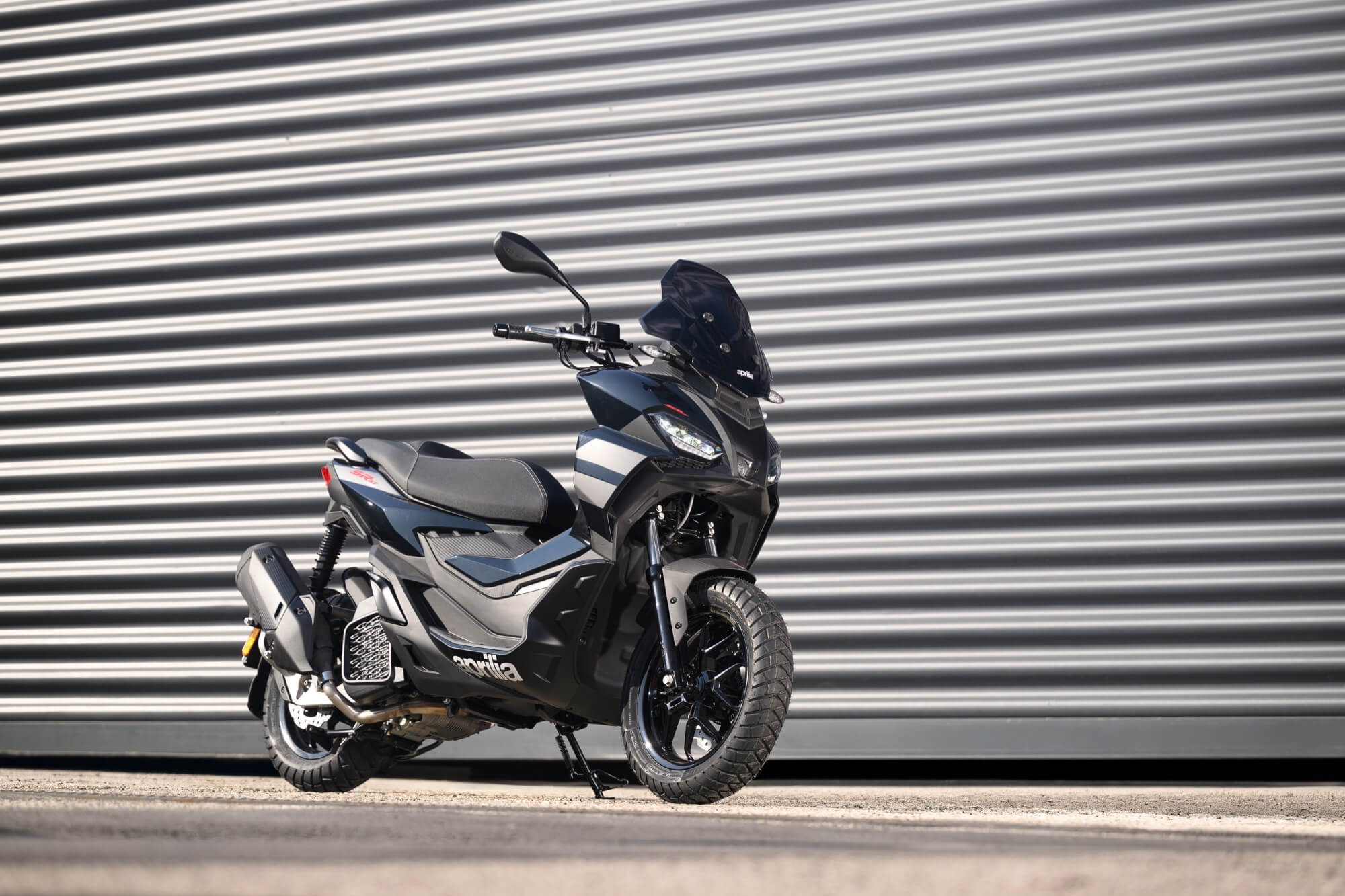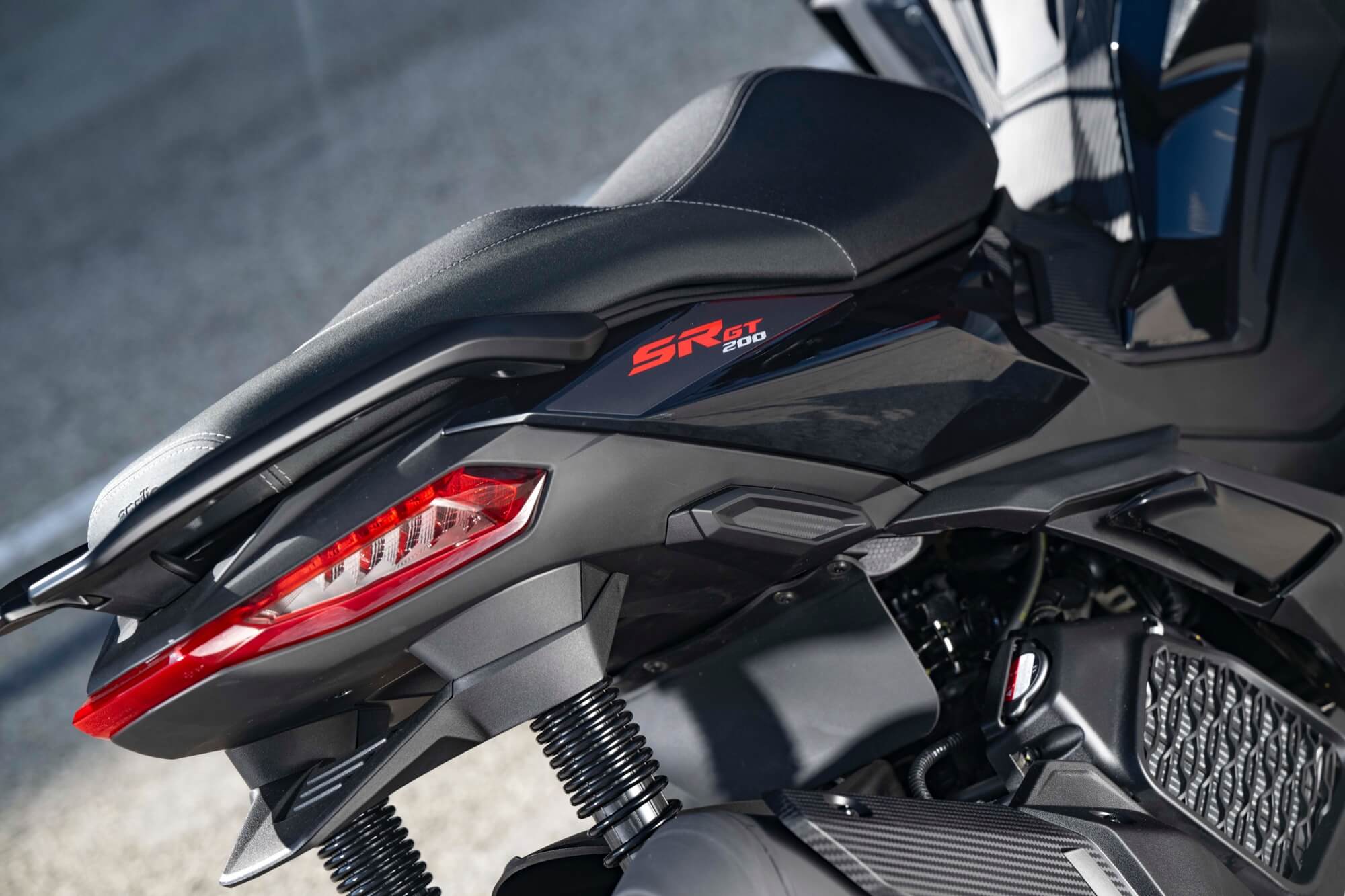 A gritty Sport version joins the range. As well as a more classic version, Aprilia SR GT also offers a Sport trim, which boasts grittier, more sports-oriented graphics and finishes. The Aprilia SR GT is available in the metallic gloss Aprilia Black and Opalescent Light colour options, as well as in metallic matte Street Grey, combined with black rims, foot board and passenger grips. The saddle is two-tone black and grey, with grey stitching.
