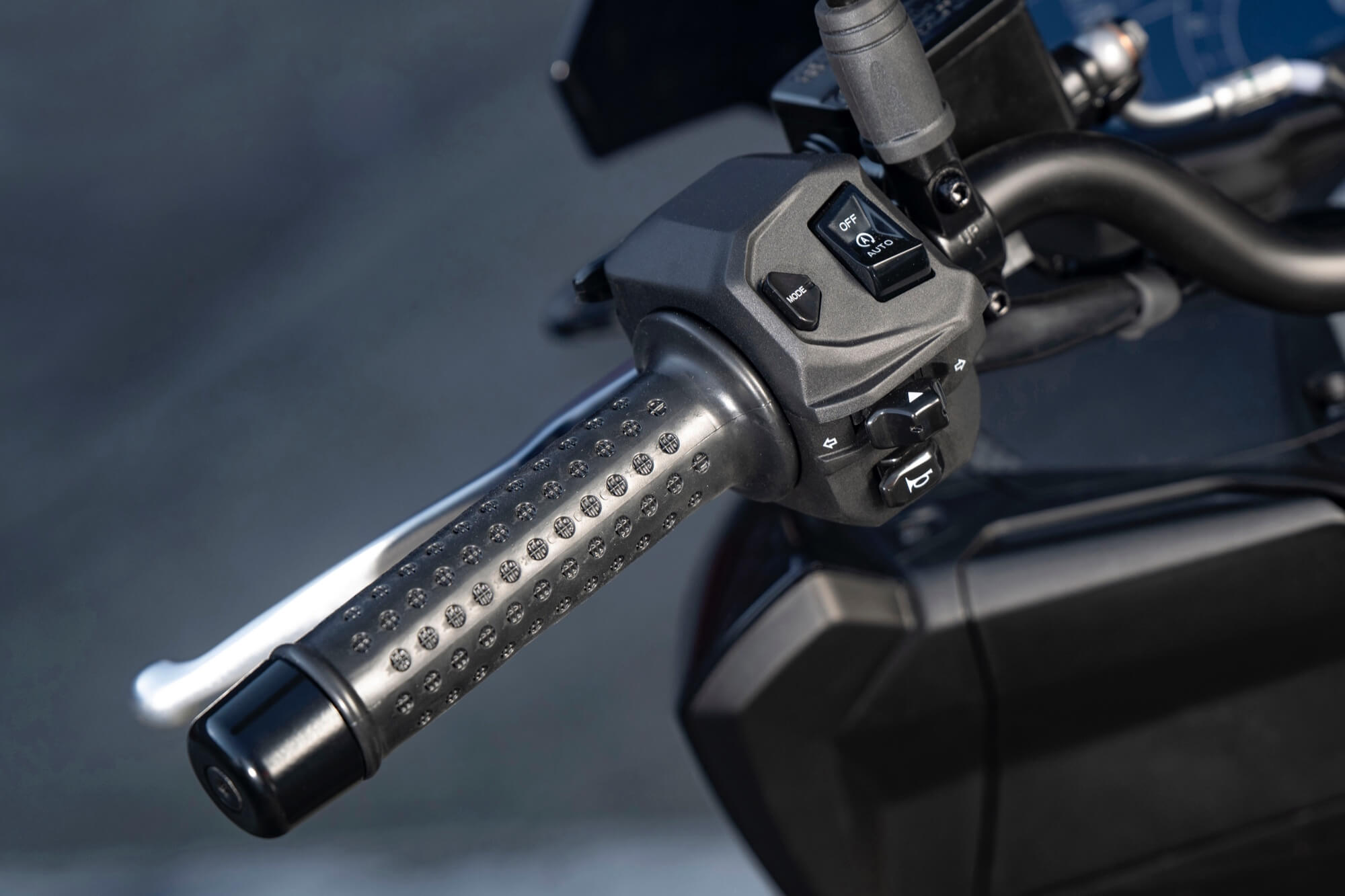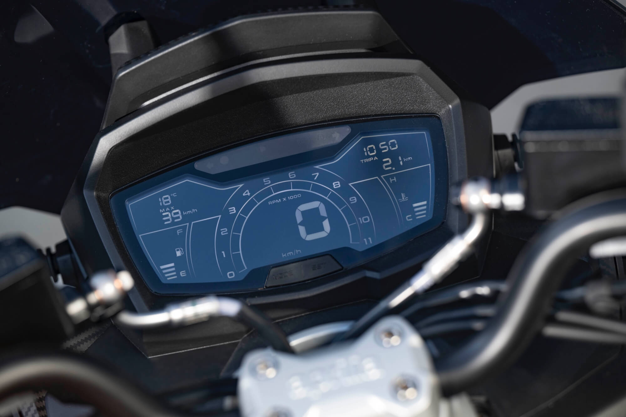 The instrumentation is fully digital, the large LCD display providing all vehicle data, as well as a wide range of travel information, which can be selected with the MODE button on the left-hand control block. If the APRILIA MIA connectivity system (available on request) is present, once a smartphone is connected to the vehicle via Bluetooth, the instrument panel will also display notifications regarding incoming calls and messages. The system also enables call management using the specific connectivity button on the right-hand control block and the use of vocal commands to make calls or play music, by activating a playlist.