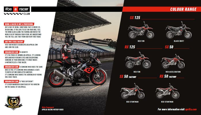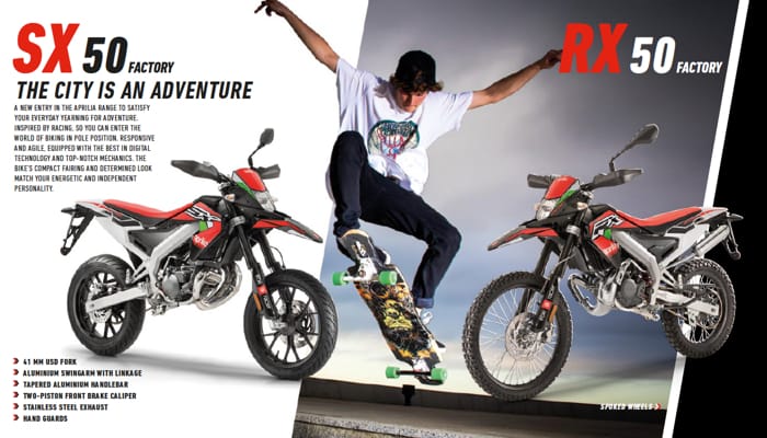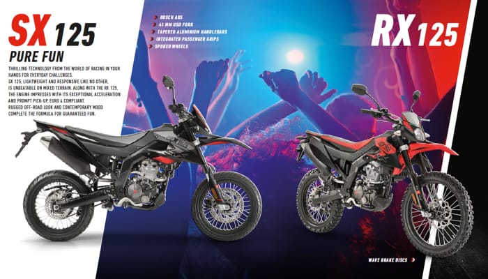 FOR YOUNG, SPORTY AND DEMANDING RIDERS, APRILIA SX AND RX 125 OFFER TOP LEVEL SPORTS CONTENTS. TWO HIGH PERFORMANCE BIKES WITH A STRONGLY DISTINCTIVE DESIGN. THE ONLY BIKES IN THIS SEGMENT TO SPORT AN ABS BRAKING SYSTEM.