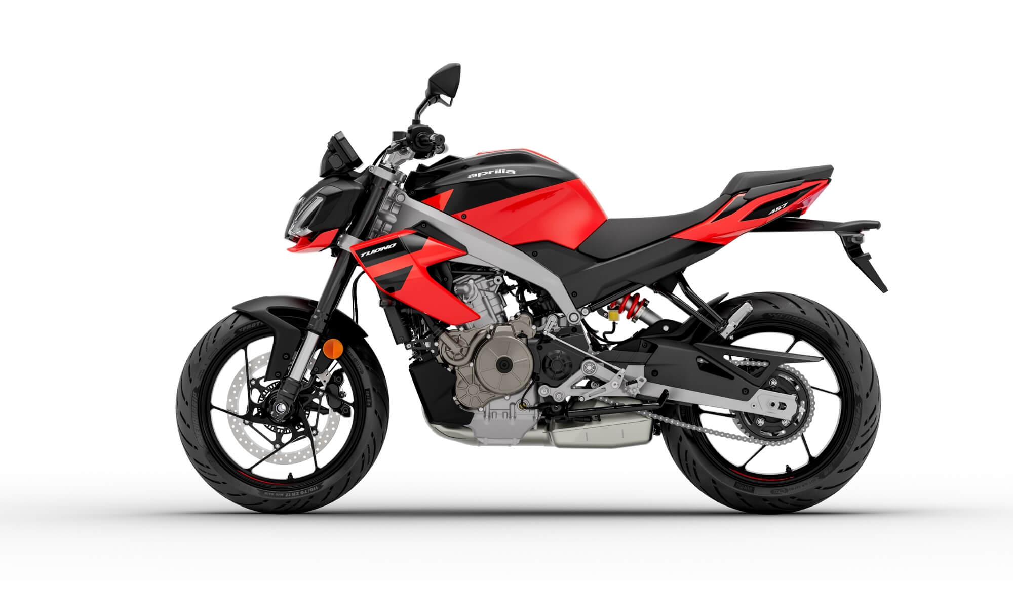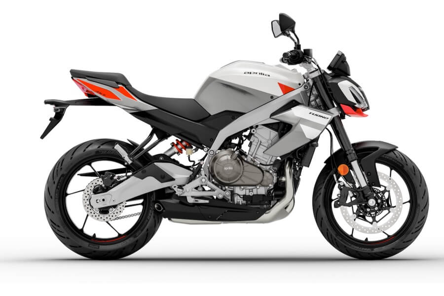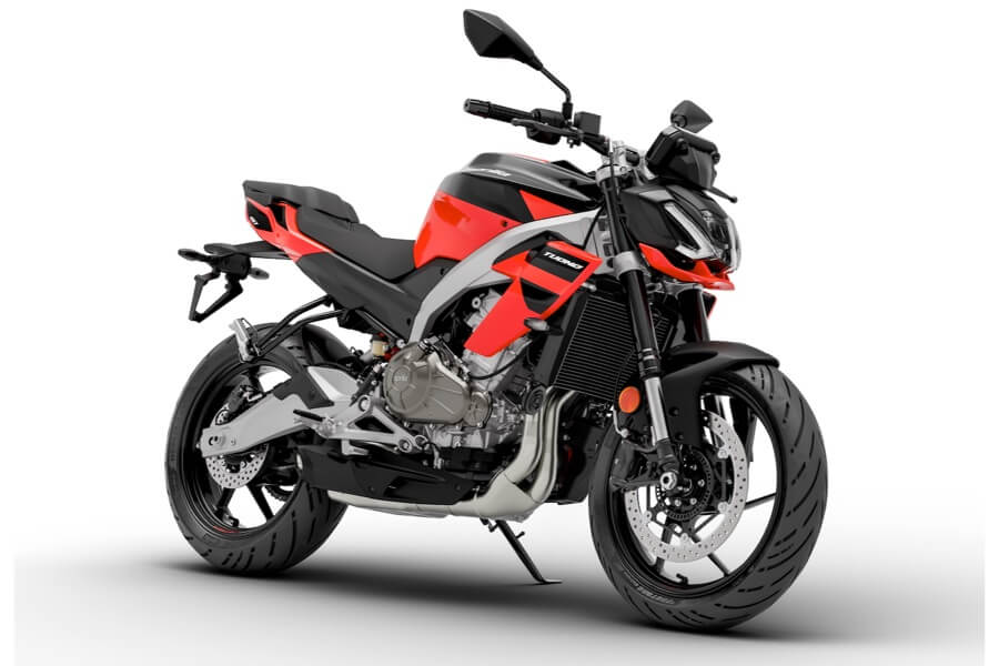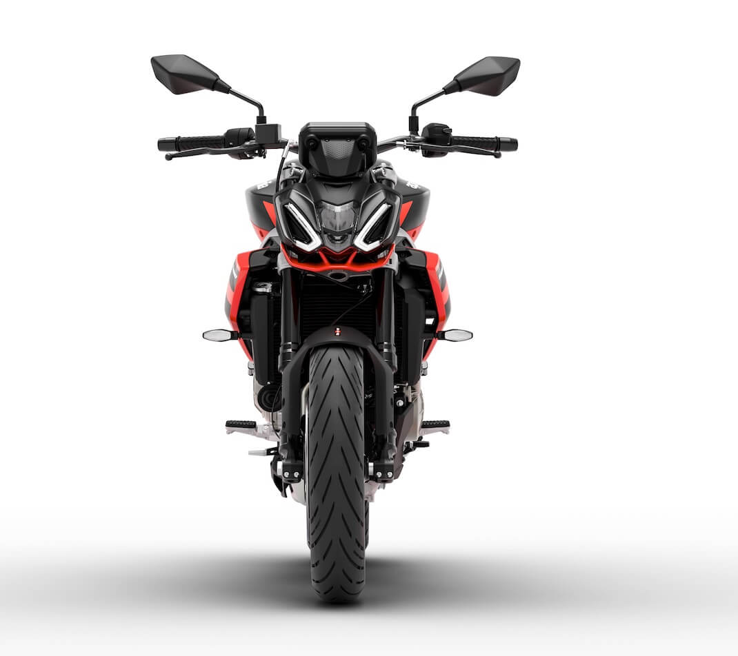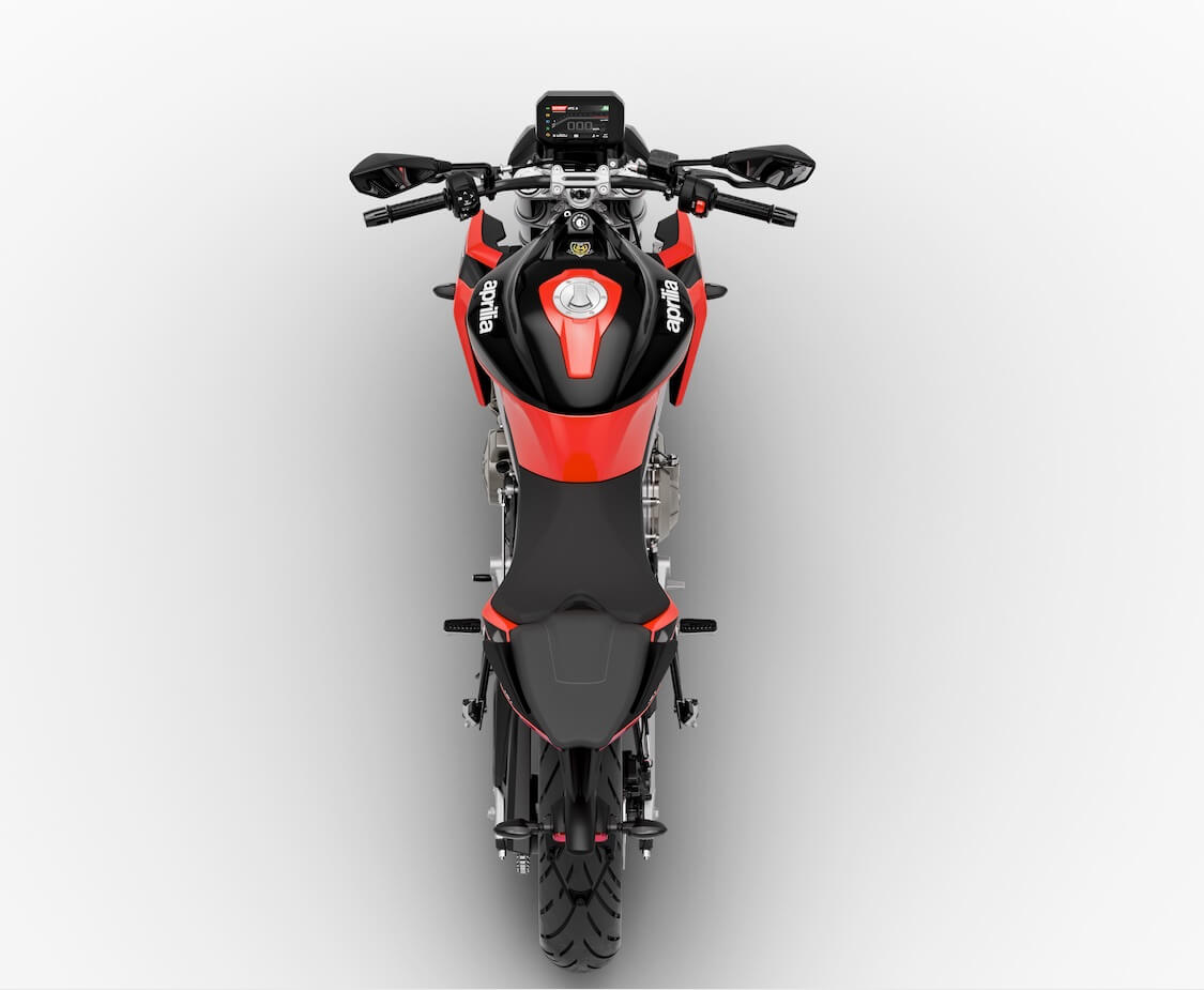 Also new is the design of the side panels and tailpiece, which echo the essential styling of the Tuono 457. The rear light cluster is also full LED, while the twin-cylinder engine with load-bearing function is intentionally left uncovered, highlighting its uniqueness in this category, as is the twin-beam aluminium frame.