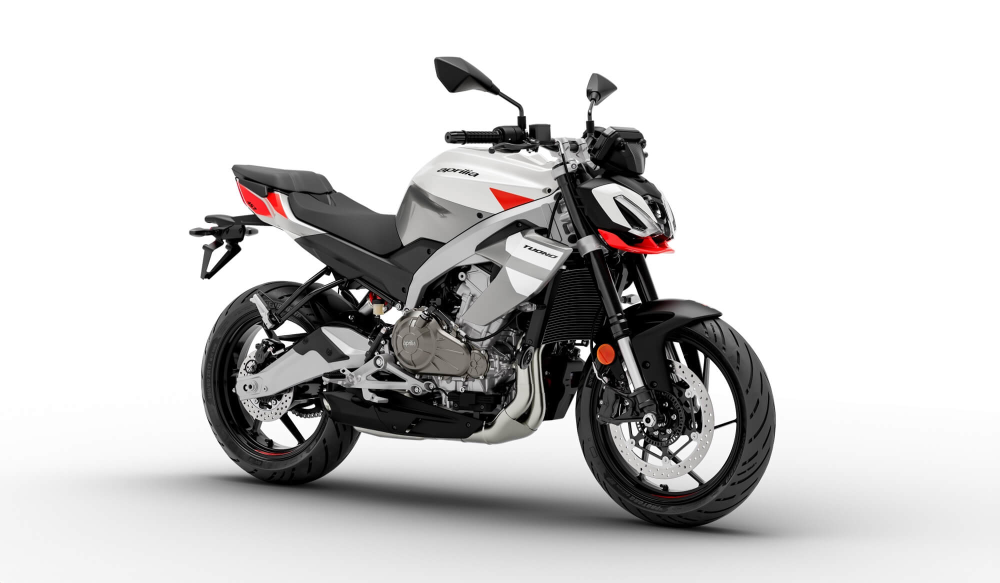 Versions and colours. The Aprilia Tuono 457 comes in two different graphic versions. The Piranha Red livery boasts the classic colours of Aprilia's history - black and red - which serve to highlight the sporty nature of the Tuono 457. The second graphic version is called Puma Gray and features more sober colours, grey and white, which lend the Tuono 457 a more urban look.
