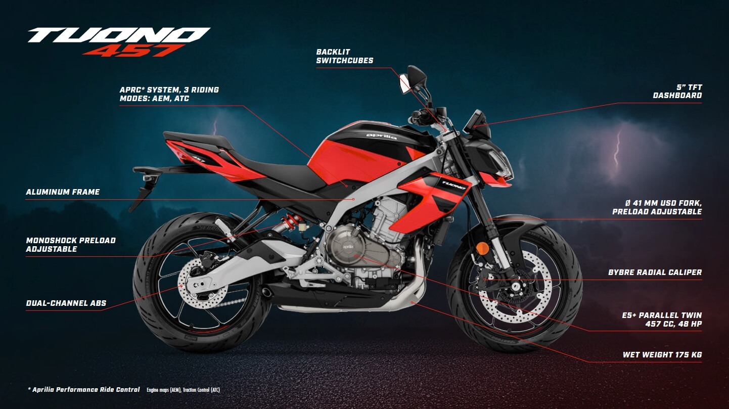 DEDICATED TO YOUNG BIKERS ALL OVER THE WORLD, IT IS 100% TUONO: UNIQUE PERFORMANCE, TOP-LEVEL CONTENT AND SUPERB RIDING. THE NEW TUONO 457 BOASTS THE BEST POWER/WEIGHT RATIO IN ITS CATEGORY: EASY TO HANDLE, PURE FUN TO RIDE. THE NEW REFERENCE POINT IN TERMS OF STYLE AND TECHNOLOGY: TWIN-CYLINDER ENGINE, ALUMINIUM FRAME AND AN ELECTRONIC MANAGEMENT SYSTEM THAT INCLUDES RIDE-BY-WIRE, TRACTION CONTROL AND THREE RIDING MODES