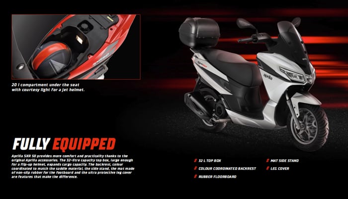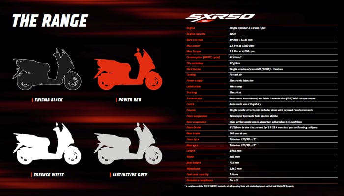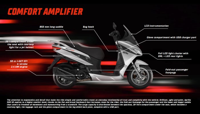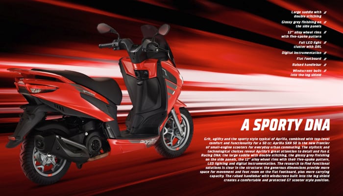 APRILIA SXR 50: SMALL DISPLACEMENT, GREAT GRIT. Aprilia SXR 50 is the urban scooter capable of combining latest generation comfort, fuel efficiency, and the gritty Aprilia personality. It is, therefore, a model suitable even for the youngest riders thanks to its agility, outstanding road holding, and competitive quality/price ratio. Dynamic and functional, with many qualities. Learn more about it here: