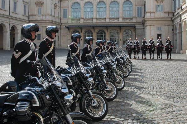 In the seventies, the V7 Sport was protagonist, accompanying Leone and Pertini, later followed by the V1000 I-Convert. In the following decades, the Moto Guzzi California dominated, from the II to the Touring, in service at the Quirinale Palace for Cossiga, Ciampi, Scalfaro, Napolitano and Mattarella who, during his first presidential term, saw the two new V85 TT Guardia D'Onore bikes come alongside the California 1400 units.