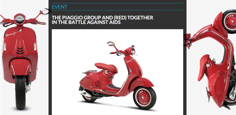A collaborative partnership between the Piaggio Group and (RED) has created the (VESPA 946) RED – an all-red version of the classic scooter, sales of which will go towards initiatives fighting AIDS, tuberculosis and malaria. The (VESPA 946) RED has been designed with elegance and style in order to show sensitivity to this serious problem. It symbolises the chance to join the battle against some of the most difficult illnesses humankind has to face.