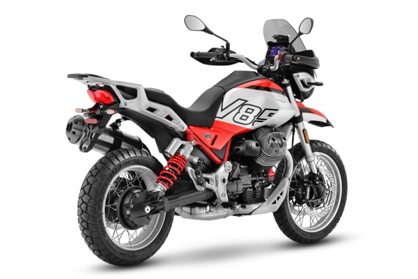 Moto Guzzi V85 TT. Moto Guzzi V85 TT is the “all-terrain” that embodies the original spirit of the V85, with a highly evocative appearance and styling that harks back to the atmospheres of the 1980s and the enduro bikes on which you could do everything, from everyday transport to adventurous travel. Moto Guzzi V85 TT keeps the adventure going even when the asphalt comes to an end. It's equipped with spoked wheels that accommodate tubeless sculpted tyres of 17” and 19” (150/70-17 and 110/80-19 respectively), sizes that will satisfy even off-road enthusiasts. Additionally, the engine is shielded by a new aluminium skid plate and the hand grips feature improved, more protective hand guards. The Moto Guzzi V85 TT stands out for its red painted frame, combined with the evocative two-tone Rosso Fuji and Grigio Tambora livery. Even the rear shock absorber spring is red and can be easily adjusted for preload using a convenient knob.