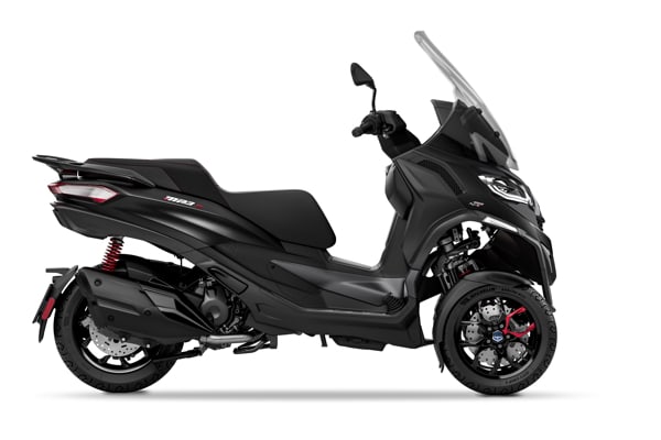 Piaggio MP3 400 HPE Sport. The Piaggio MP3 400 hpe Sport is available in four colour schemes: Nero Meteora, Bianco Luna, Grigio Titanio, and Arancio Sunset Matt, all colours combined with gritty black painted wheel rims and a black seat with contrasting red stitching. Other red details, such as the front and rear shock absorber springs and the element on the wheel rims emphasise the sporty look. The glossy black of the external finishings, including the mask on the front end, creates another strong contrast, whereas the internal finishings (instrument panel frame, dashboard, strips on the central tunnel) are in matt grey. Front brake discs with a wave profile and a foot board with aluminium inserts are included as standard.