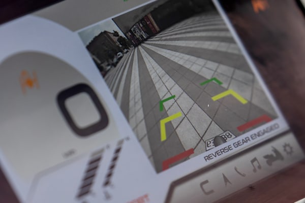Reverse gear is activated via a dedicated control on the dashboard, with the engine on and the vehicle at a standstill. When reverse is engaged, the image of the rear area is shown on the TFT display, integrated by grids.