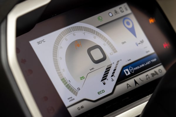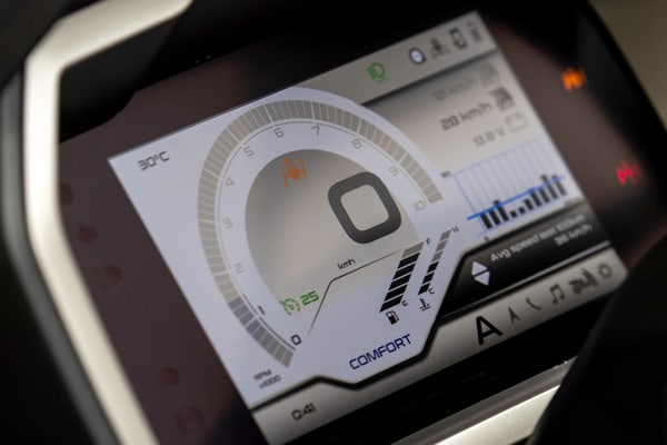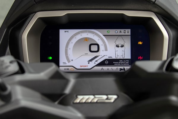 The large size of the display means that even more legible and bold graphics could be used. All the trip information (total and partial odometer, average speed, instantaneous and average consumption, range) are grouped on the right side, as are all the call and message notifications and navigation indications of the PIAGGIO MIA system.