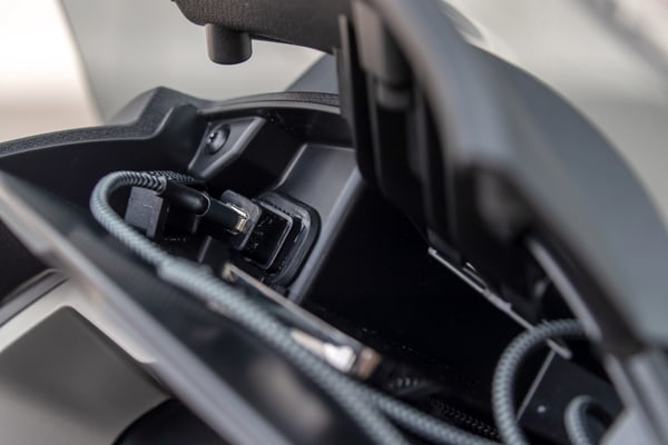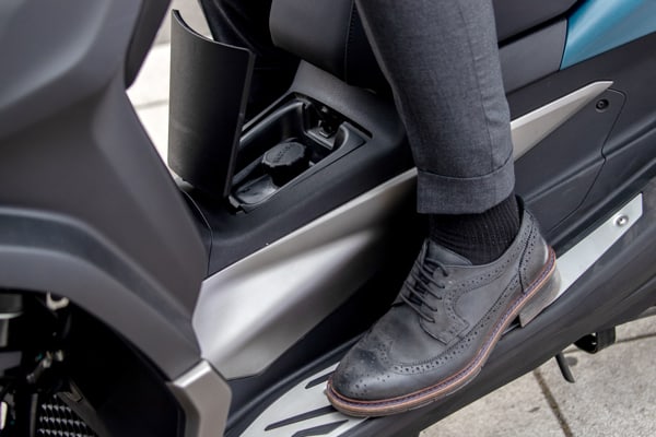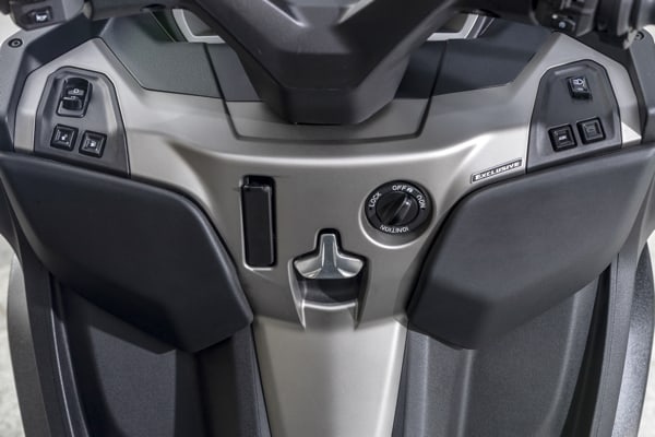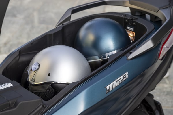 The leg shield back plate has two anti-impact pads the colour of the saddle in front of the rider's knees. There is also a convenient, retractable bag hook. The compartment above the instruments has a drawer and USB connection, ideal for recharging a smartphone and any other enabled device.