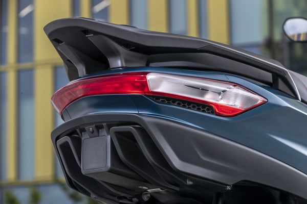 The new model boasts many cues inspired by the latest trends in automotive design, such as the more imposing, sportier front fascia and turn indicators integrated into the wheel arches. This trend is even more visible as you look towards the rear end, with its taut lines that lead to the taillight unit, a unique, full LED horizontal element with built-in turn indicators, below which an original, extractor type profile opens up. The tail is generally more compact and sleek: the all-new position of the license plate holder on the mudguard, a solution making its first appearance on the Piaggio MP3, contributes further to the extremely lean, uncluttered look of the tail.