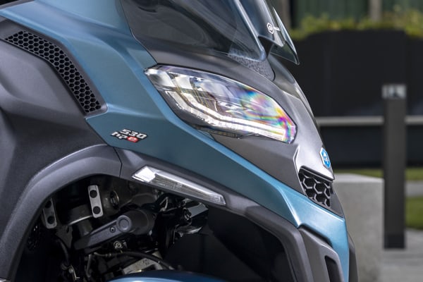 Thanks to other lightening operations as well, the 530 hpe version boasts a total weight loss of 7 kg when compared with the previous Piaggio MP3 generation, all to the advantage of dynamic performance, for which another contributing factor is the fact that the radiator has been moved to a lower position, between the front wheels and the footboard.