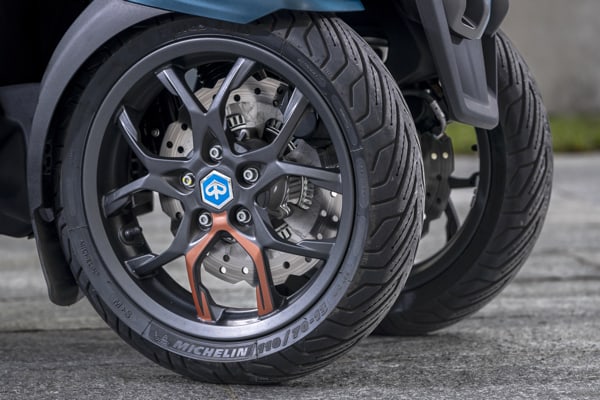 ULTIMATE SAFETY: THREE WHEELS, ABS AND ASR. The new Piaggio MP3 continues to feature the exclusive patented Piaggio technology for the dual independent, tilting front wheels regulated by a unique four bar linkage suspension, which the leading Group in Europe designed and developed before any other manufacturer in the world to ensure maximum riding pleasure in complete safety.