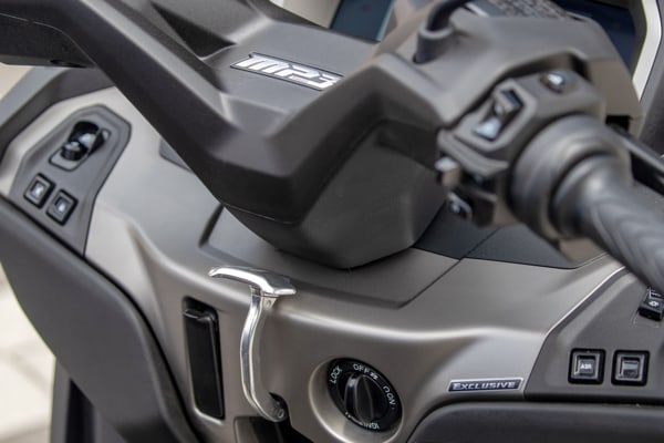 Also on the user interface front, all the models in the new Piaggio MP3 range feature the keyless system, which lets you activate the ignition without having to insert the traditional key, simplifying all the operations like starting the engine, opening the seat and the fuel door and locking the steering column, all of which can be done with the remote control conveniently in your pocket. On the leg shield back plate, the classic ignition key switch is replaced by a practical knob: to start the vehicle, simple press it (thereby activating the start enable signal, indicated by a welcome message on the TFT display) and turn it to the ON position. Starting the engine is accomplished as usual with the button located on the right-hand control bock.