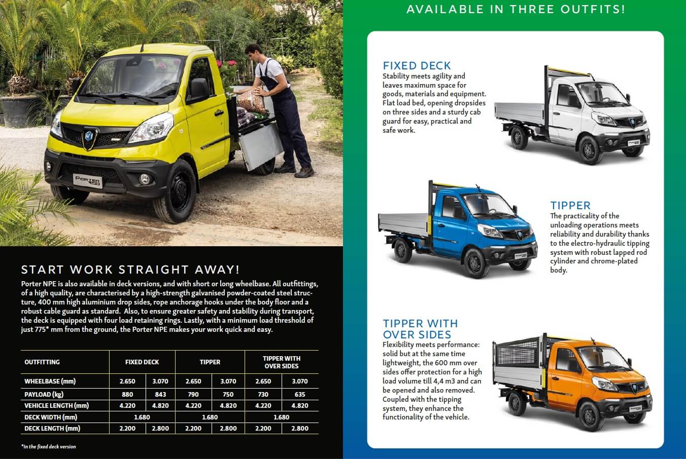 MANEUVRABILITY, COMFORT, QUIET OPERATION, RECORD-BREAKING PAYLOAD, AND THE NEW ZERO-EMISSIONS POWERTRAIN: PORTER NPE IS IDEAL FOR SHORT- AND MEDIUM-RANGE GOODS TRANSPORT, INCLUDING IN CONTROLLED-ACCESS AREAS. THREE NEW CONFIGURATIONS – FIXED BED, TIPPER BED AND TIPPER WITH EXTENDED SIDE PANELS – DEBUT ALONGSIDE THE CLASSIC CHASSIS VERSION AND ARE NOW AVAILABLE AT DEALERSHIPS