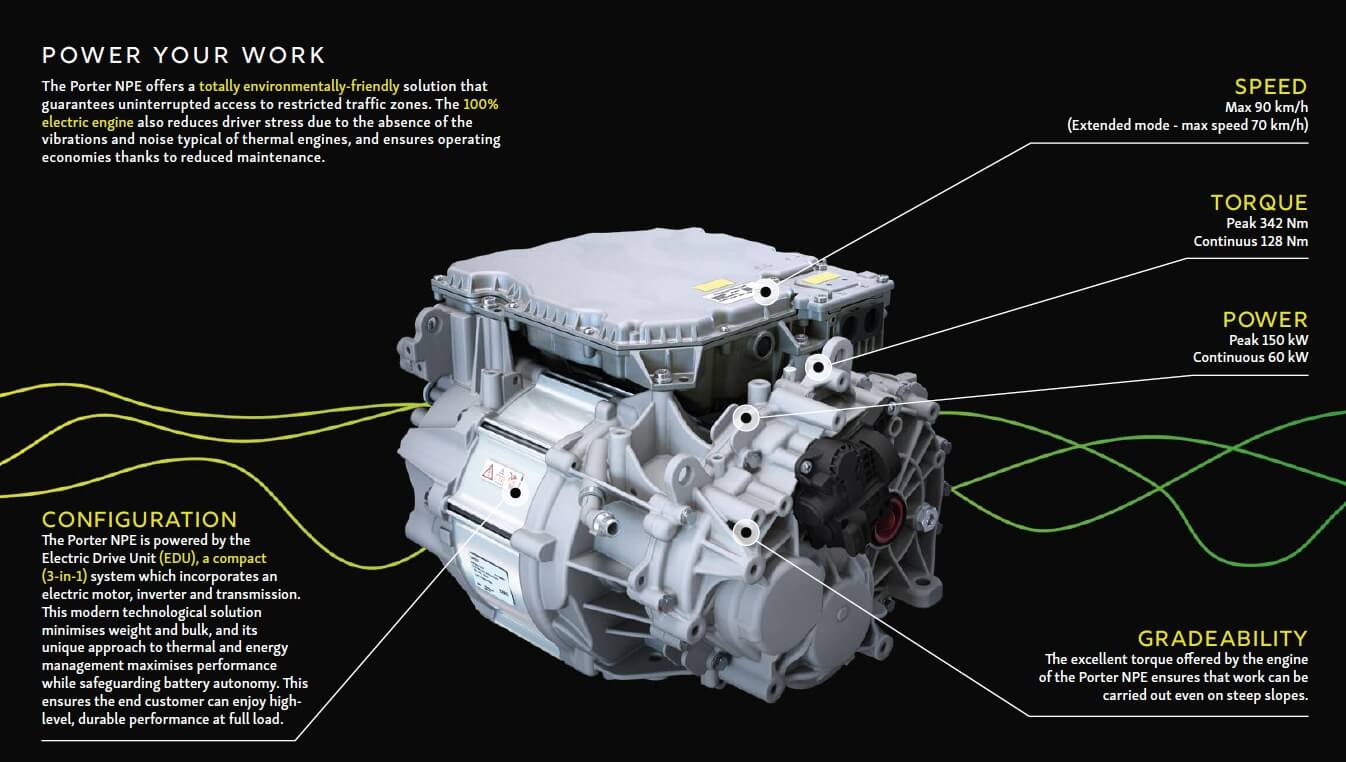 The core of the new Porter NPE is the Electric Drive Unit (EDU), a compact system that combines the electric motor, inverter and transmission components. This solution is designed to deliver high performance and maximum efficiency while minimising weight and overall size. The system, conceived in this way, provides the customer with high, consistent and long-term performance.
