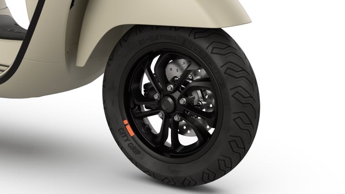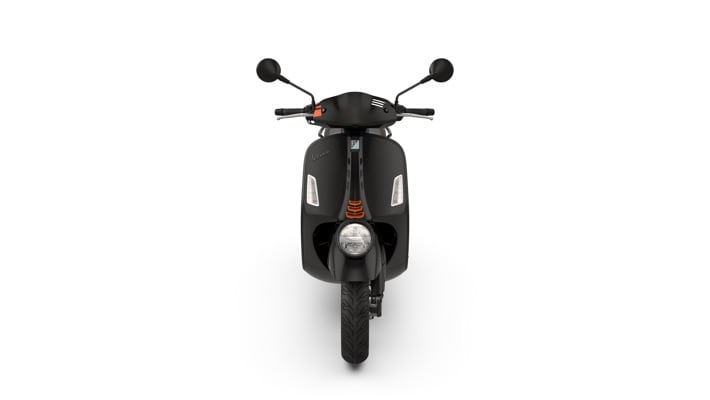 At the centre of the leg shield, the unmistakeable “necktie” has sporty lateral slots and is enhanced by orange-edged decorations. The five-spoke wheel rim design is also new, painted matt black with orange graphics on the channel.