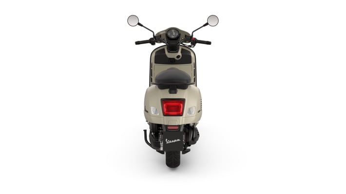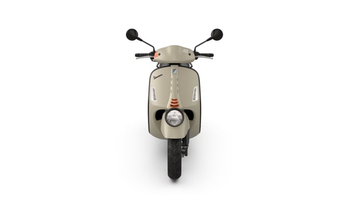 The new Vespa Gtv is available in the two colour schemes, Beige Avvolgente Opaco and Nero Convinto, with contrasting orange graphics on the front fairing and on the sides.