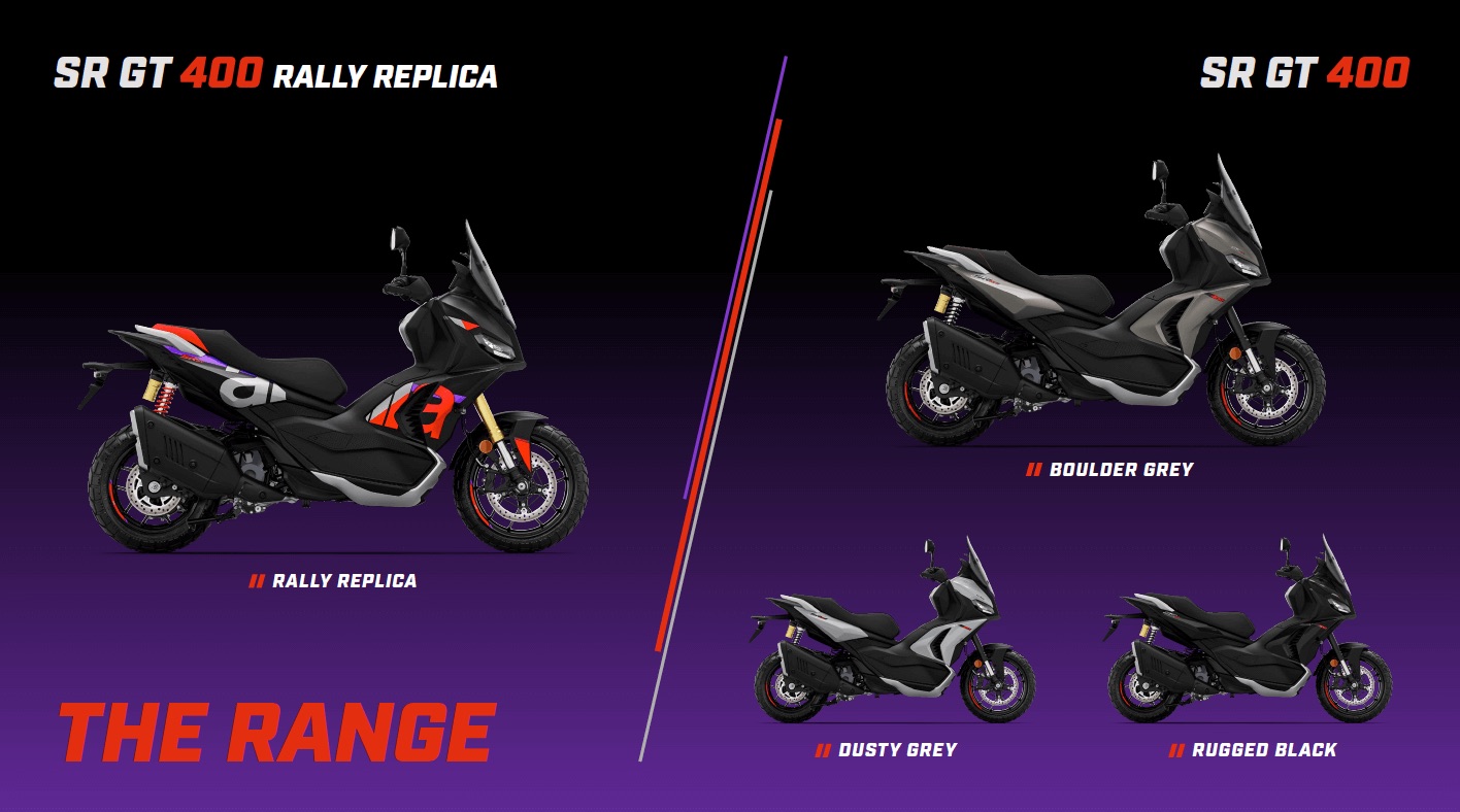 The Aprilia SR GT 400 is available in three different colour options: Rugged Black, Boulder Grey and Dusty Grey, and in the special Rally Replica version.