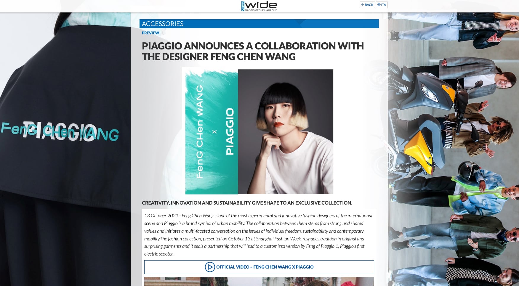 INTRODUCING THE FIRST PIAGGIO E-SCOOTER IN A VERSION CUSTOMISED BY DESIGNER FENG CHEN WANG. FUNCTIONALITY, SUSTAINABILITY AND DESIGN COME TOGETHER IN A REINTERPRETATION OF CONTEMPORARY MOBILITY VALUES. THE COLLABORATION ALSO SEES A DEDICATED HELMET AND A SPECIAL STREETWEAR COLLECTION.